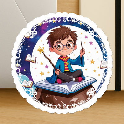 Round Wizard Boy on Book Vinyl Sticker – Magical Theme, Water-Resistant