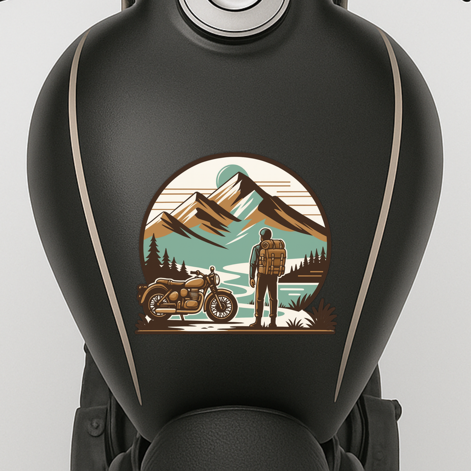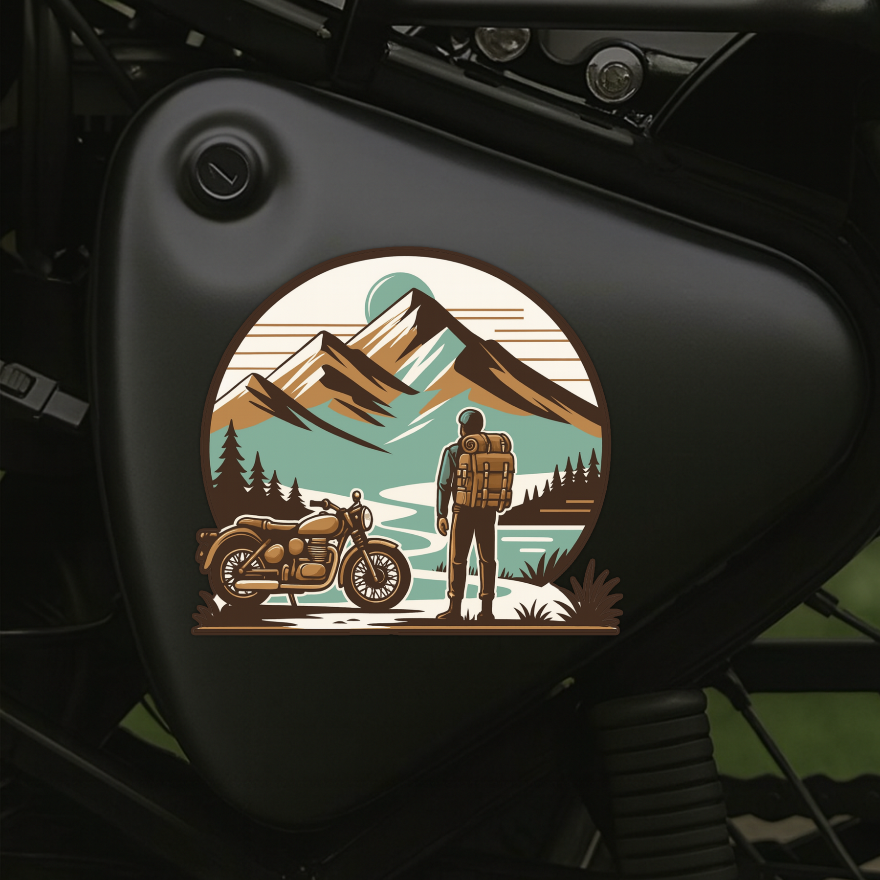 Capture the freedom of open roads with the STIXY Waterproof Mountain Ride Explorer Sticker, crafted for bikers and wanderers who chase the call of the mountains. This minimal yet powerful design STIXY sticker blends the thrill of riding with the calm of nature — showing a biker and his machine pausing to admire the wild.