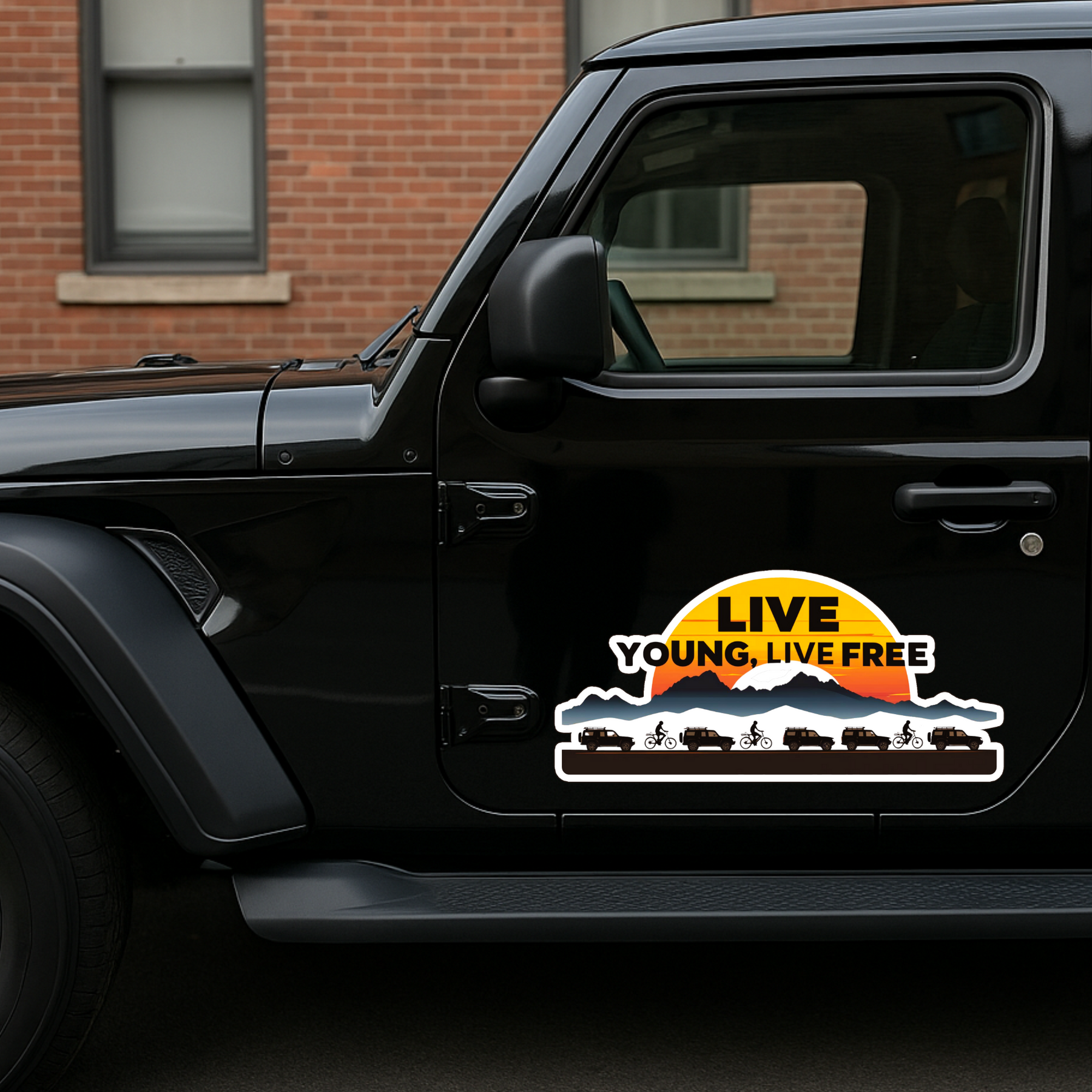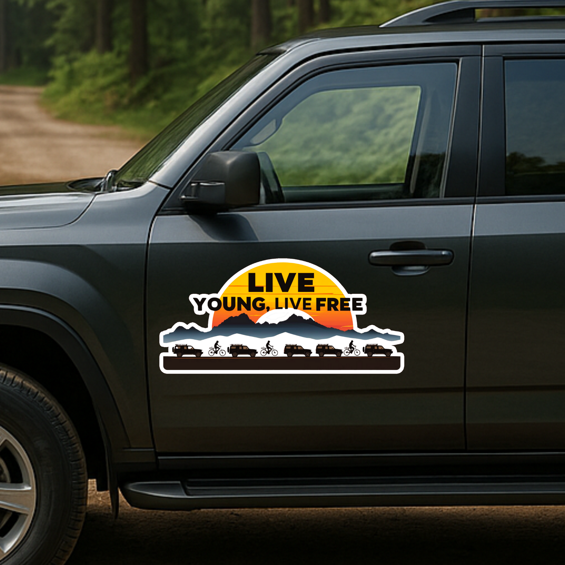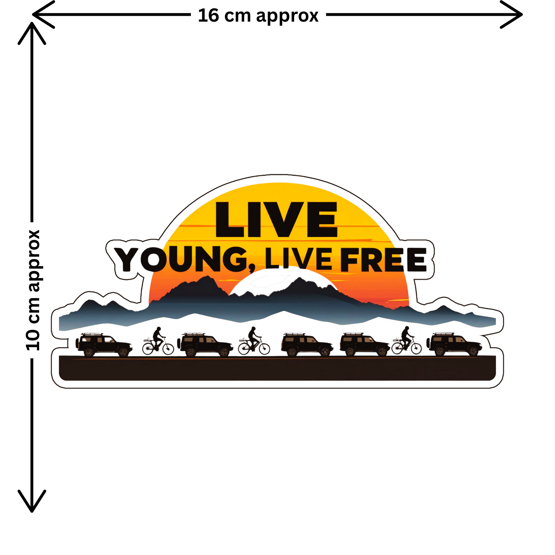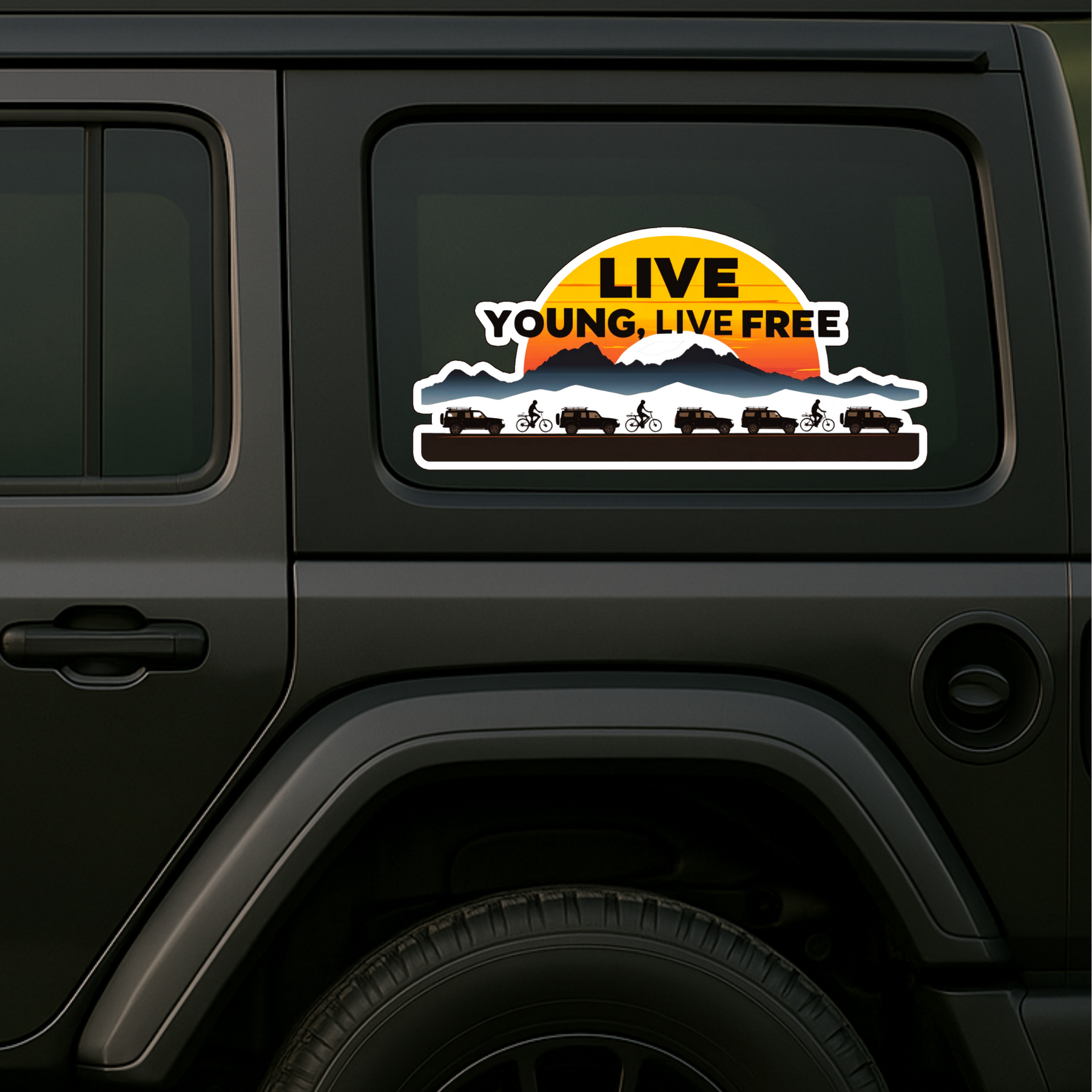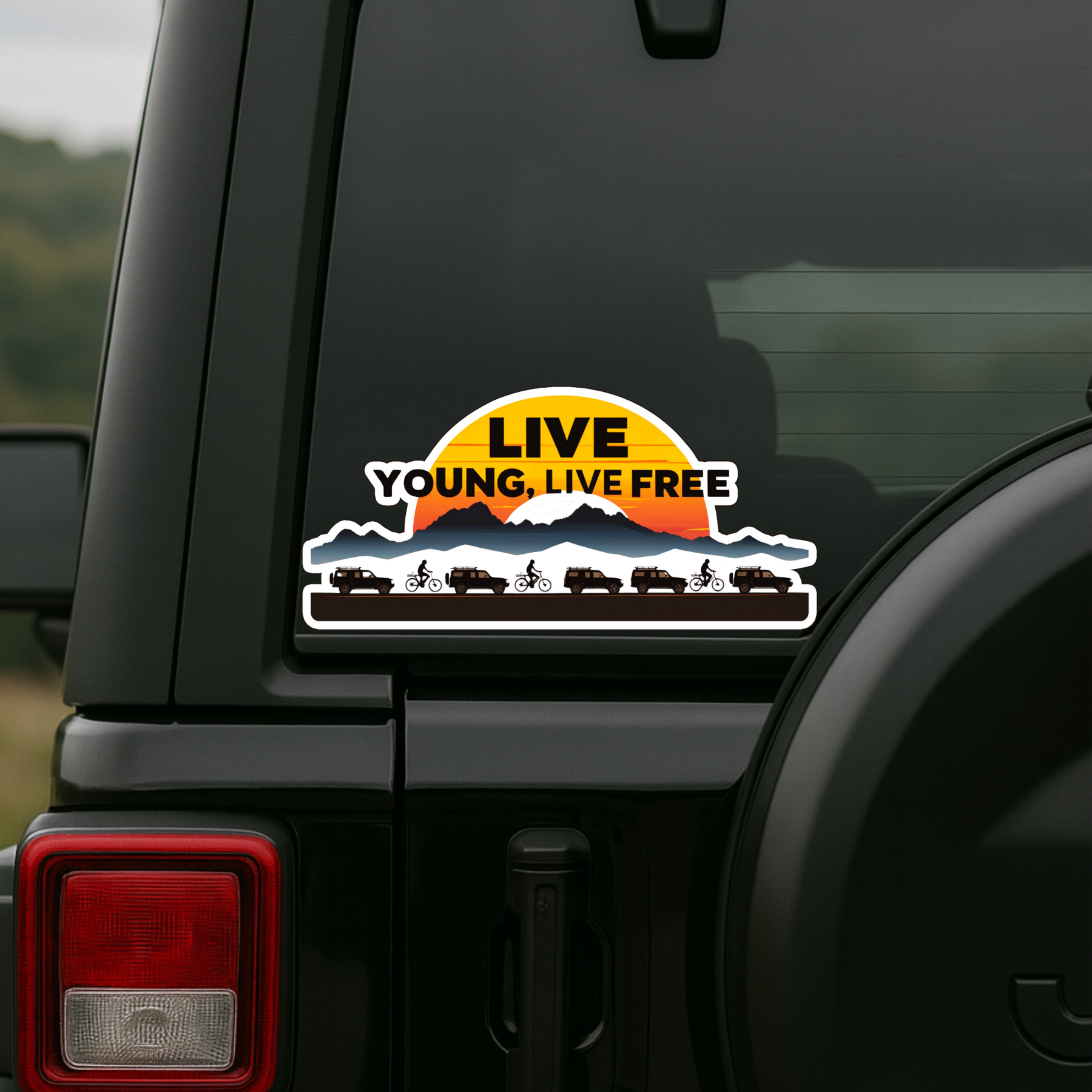 Celebrate the spirit of freedom and adventure with the STIXY Live Young, Live Free Sticker, a waterproof STIXY sticker designed for thrill-seekers and wanderers at heart. Featuring stunning silhouettes of jeeps and cyclists against a vibrant mountain sunset, it perfectly captures the joy of exploring life beyond limits.
