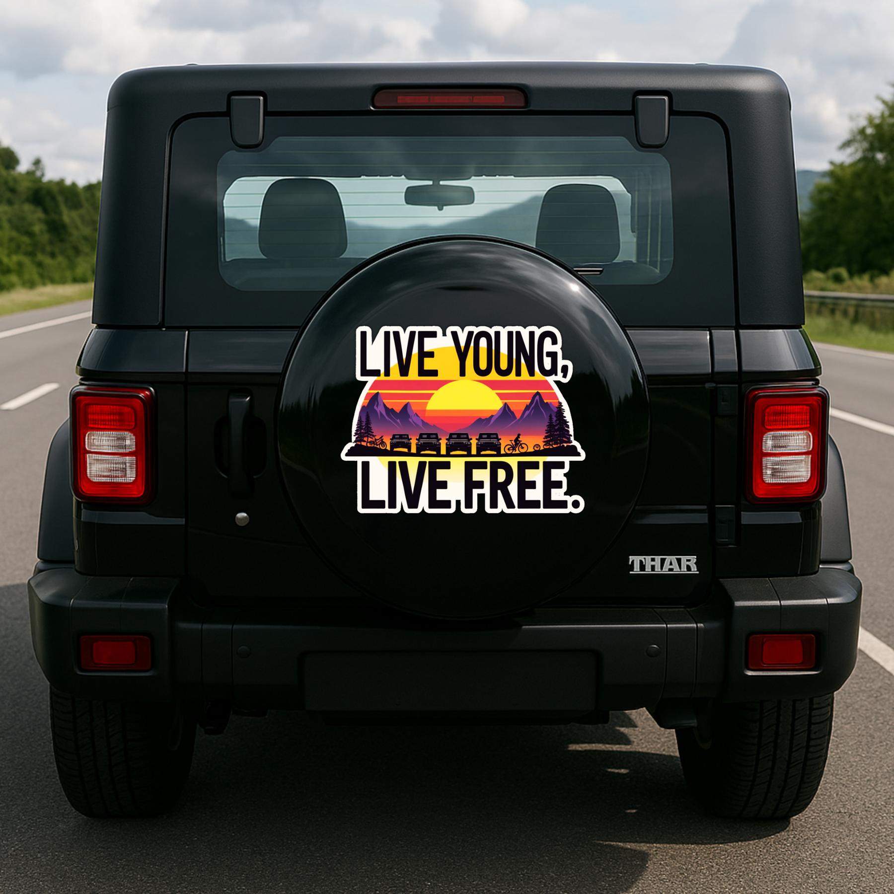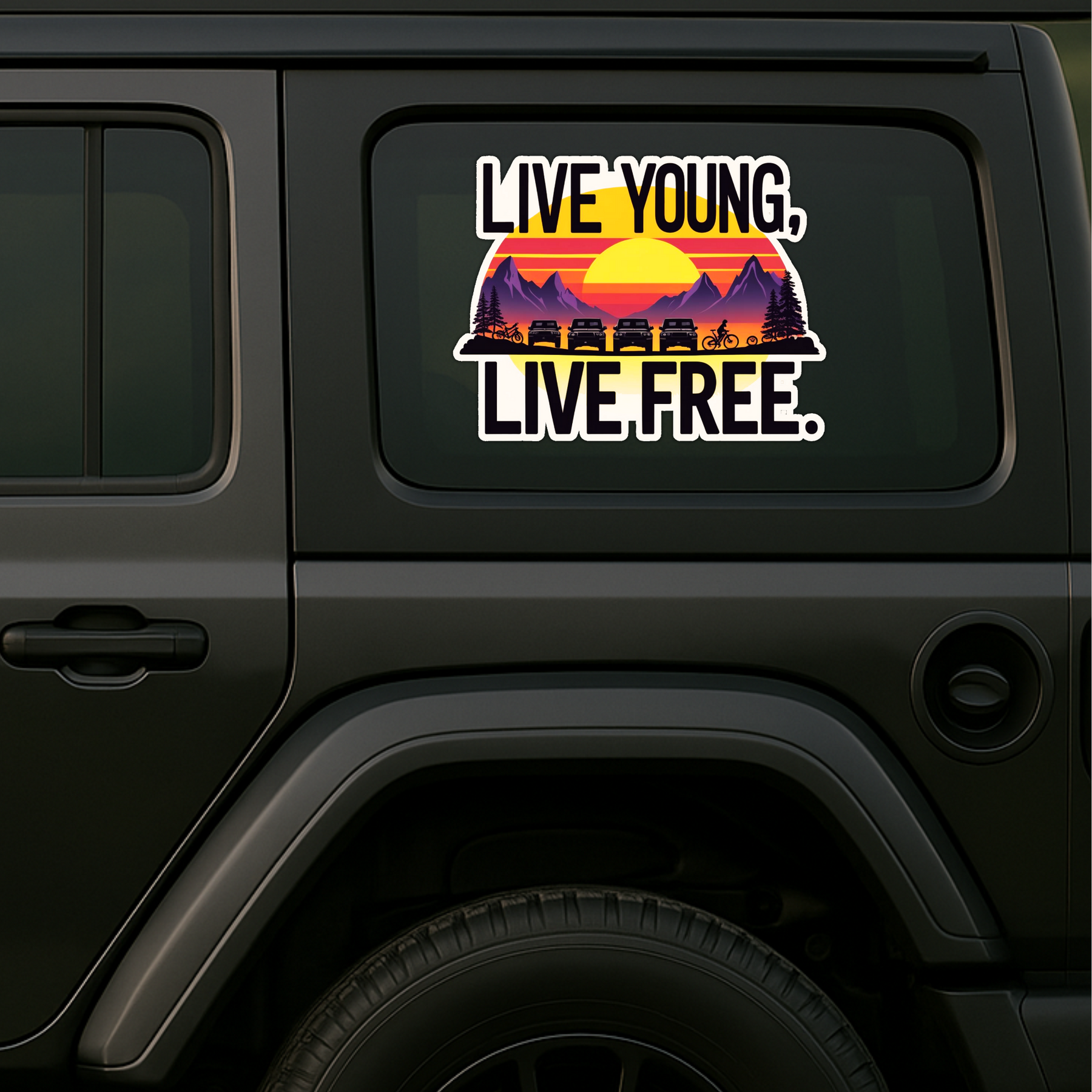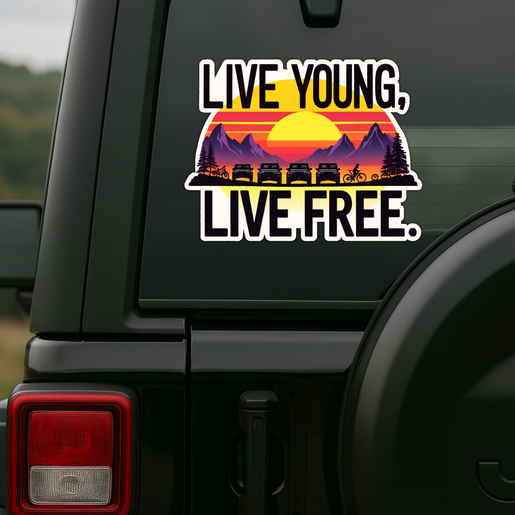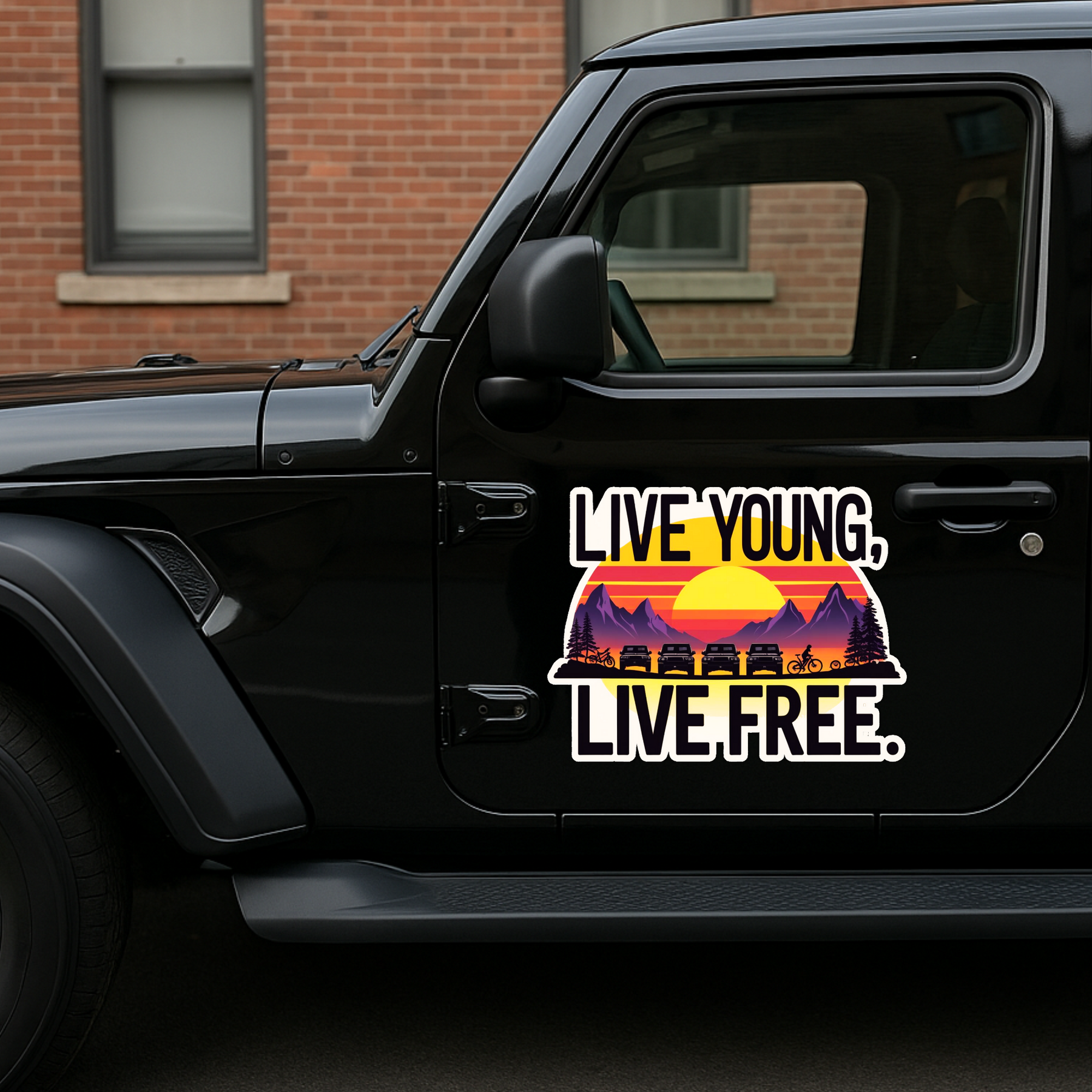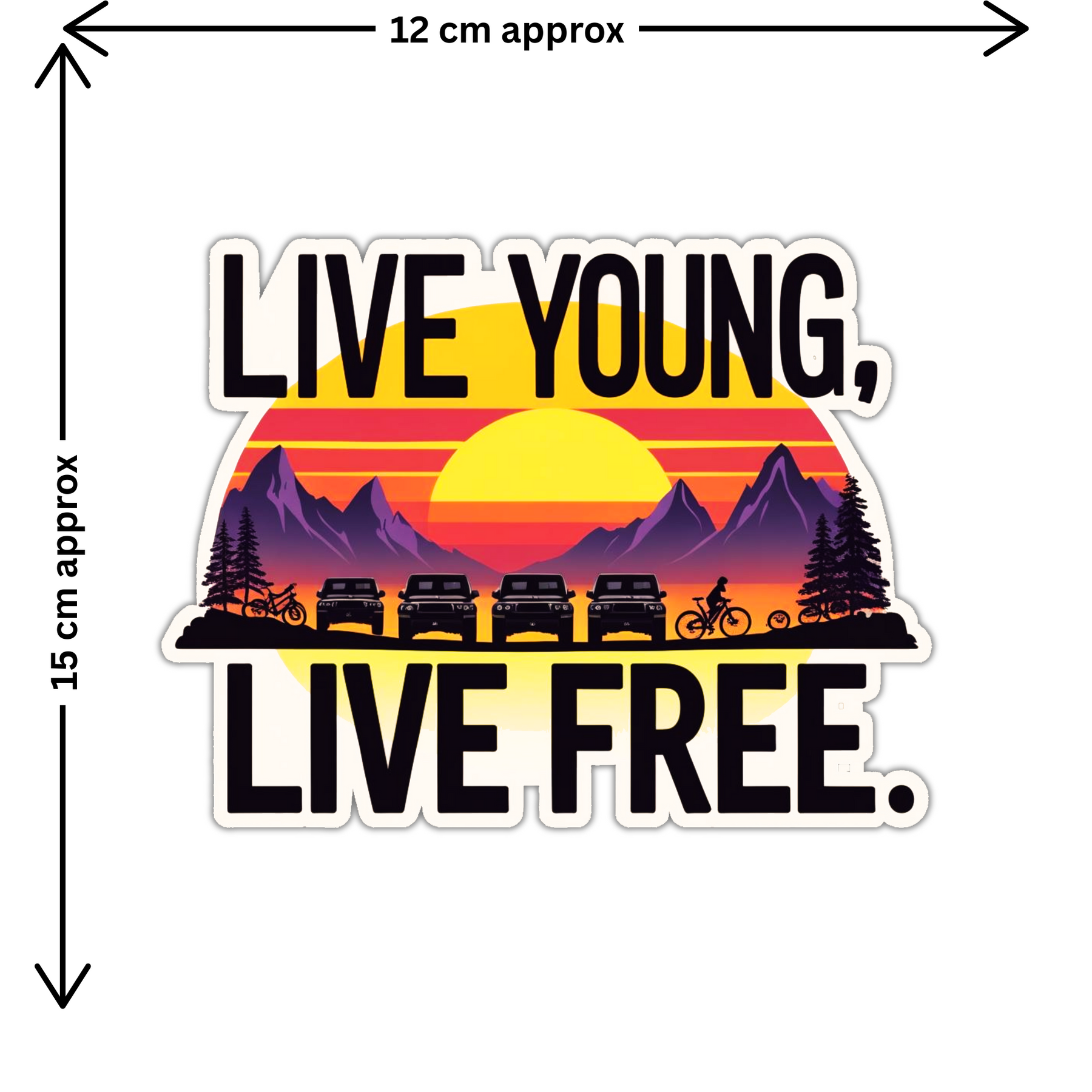 Embrace the freedom of the open road with the STIXY Live Young, Live Free Sticker, a waterproof STIXY sticker inspired by the spirit of adventure. The design captures SUVs, bikes, and mountain silhouettes under a vibrant sunset — symbolizing youth, freedom, and the love of travel.