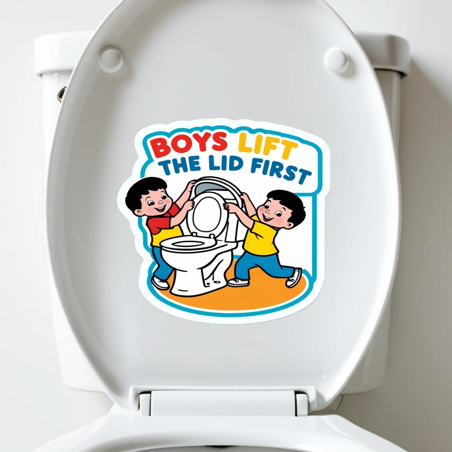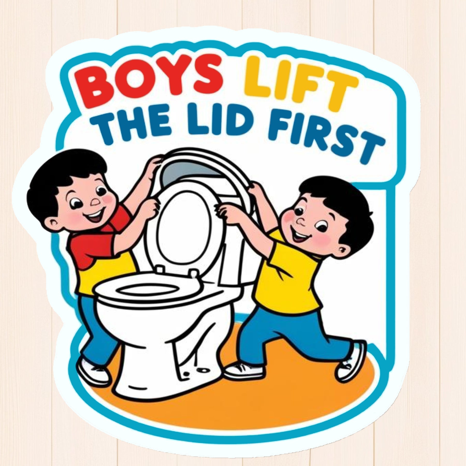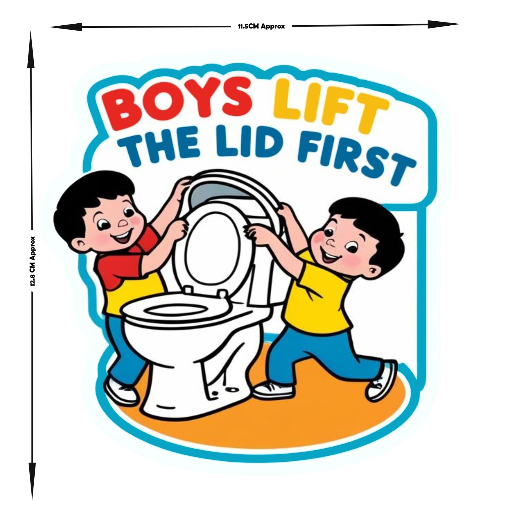 Make toilet hygiene fun and educational with this colorful “Boys Lift the Lid First” sticker featuring two cheerful cartoon boys learning good washroom habits. This vibrant design is ideal for school restrooms, homes with kids, or daycare centers. Printed on high-quality waterproof matte vinyl, it serves as a friendly hygiene reminder that both kids and parents appreciate.