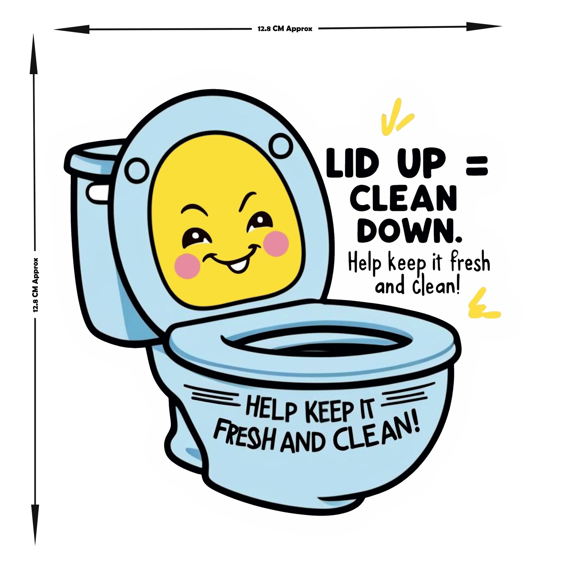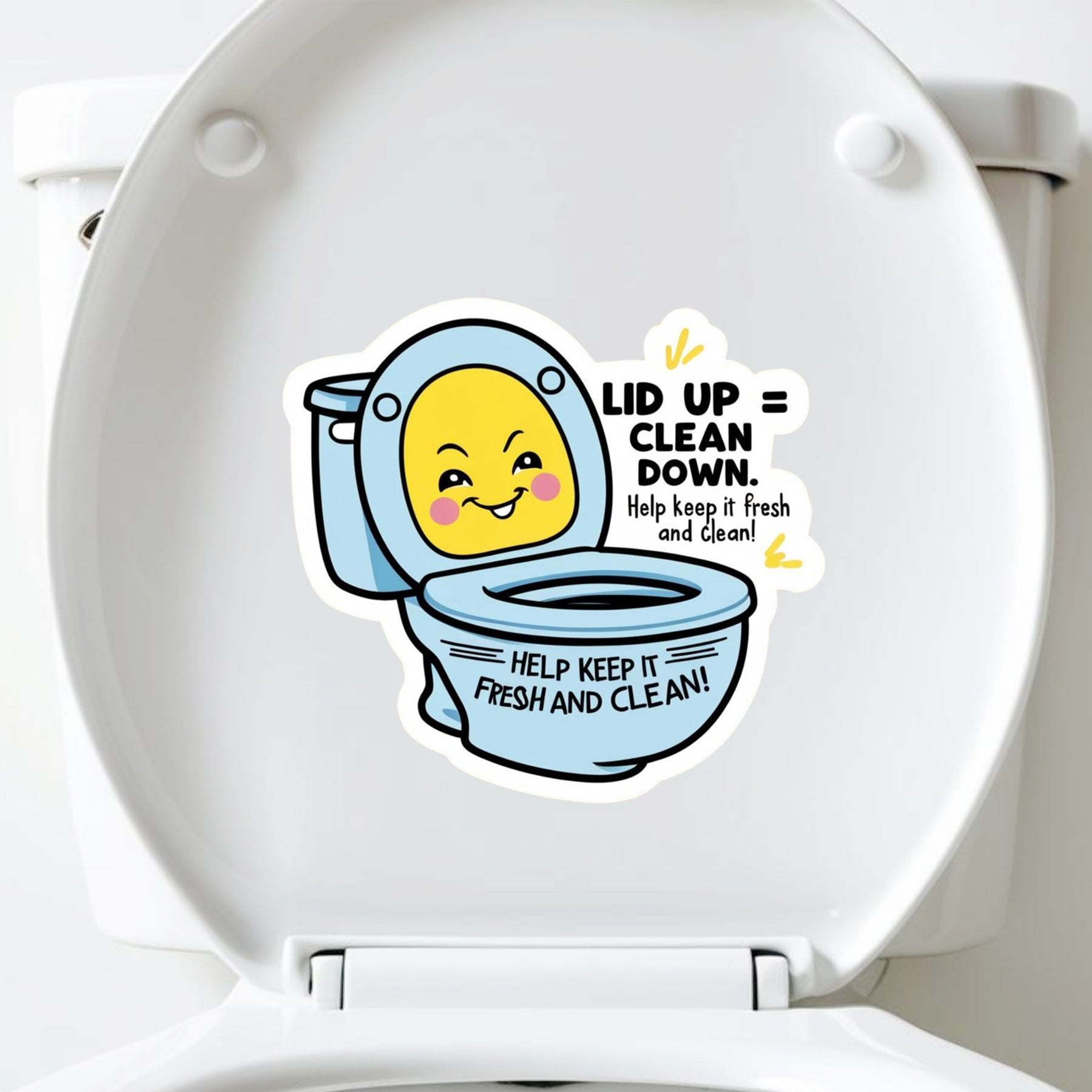 Add a splash of fun to bathroom cleanliness with this “Lid Up = Clean Down” toilet etiquette sticker. Featuring a cute cartoon toilet and cheerful reminder, this sticker encourages everyone to maintain freshness and hygiene in a humorous, eye-catching way. Waterproof and easy to apply, it's ideal for home bathrooms, offices, cafés, and shared spaces that value both cleanliness and creativity.