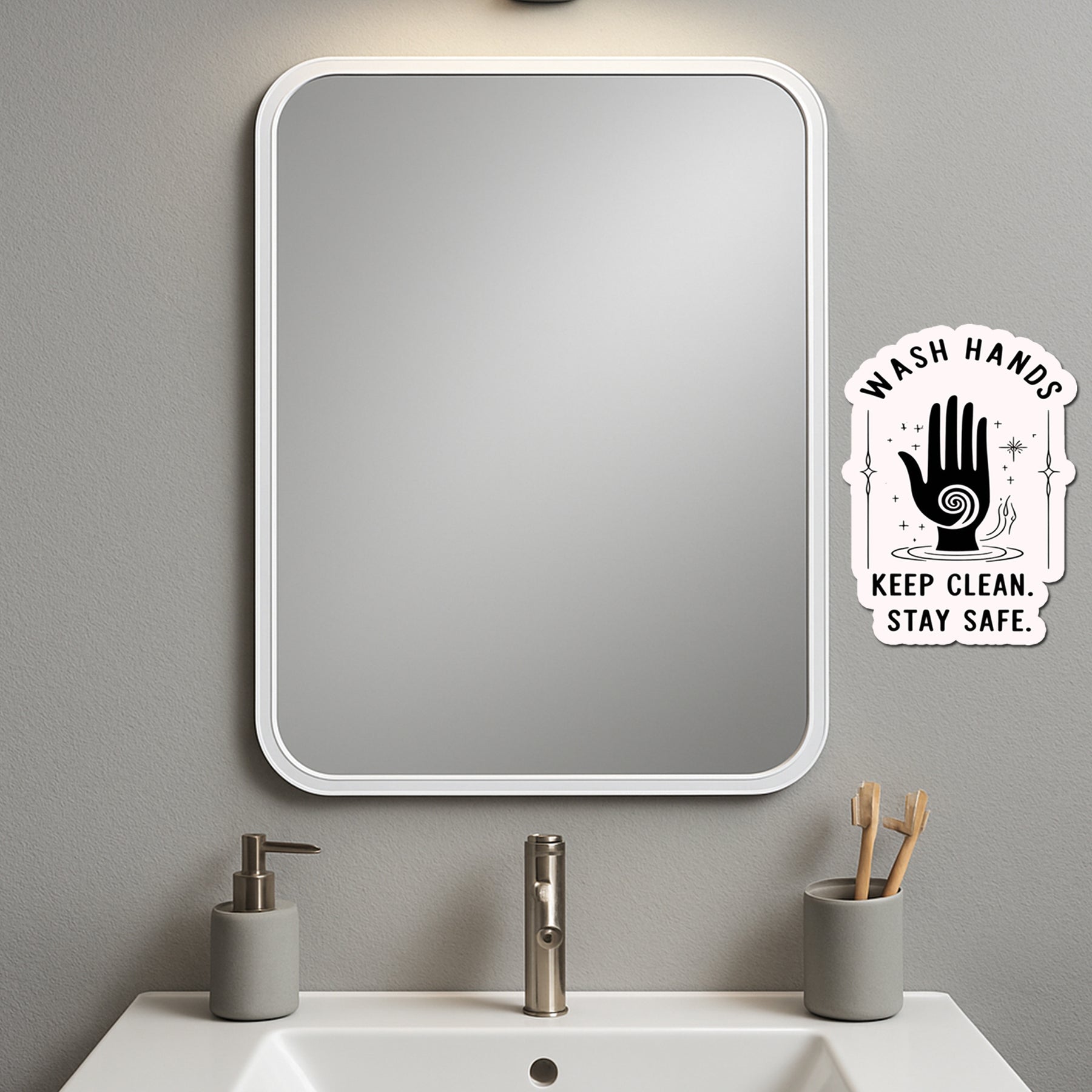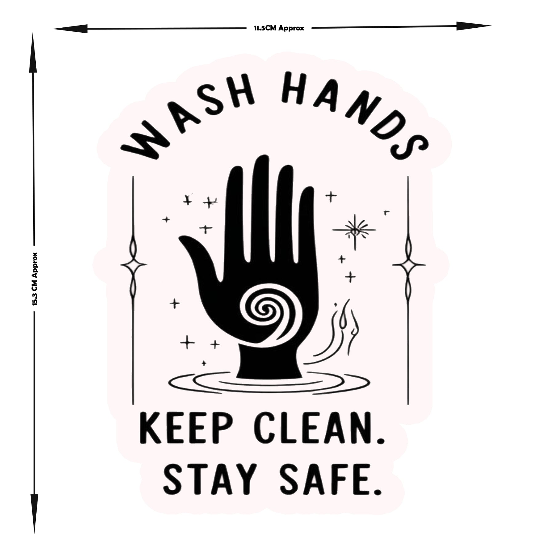 Promote mindful hygiene with this artistic “Wash Hands – Keep Clean. Stay Safe.” sticker featuring a mystical black hand design surrounded by sparkling cleanliness icons. The modern, minimalist black-and-white look makes it perfect for washrooms, sinks, cafes, clinics, or classrooms. Printed on premium waterproof matte vinyl, this sticker brings elegance and awareness together.