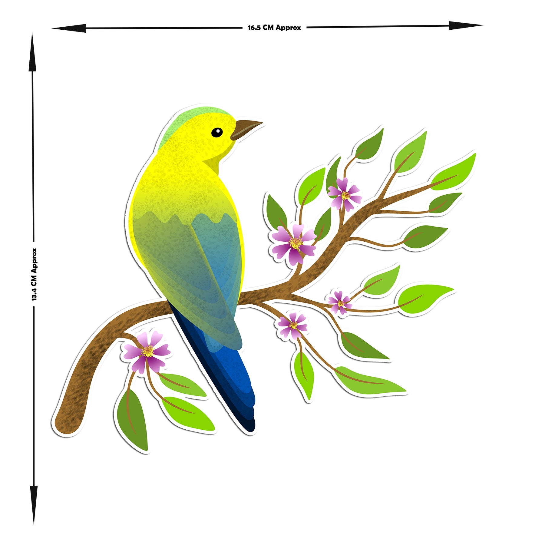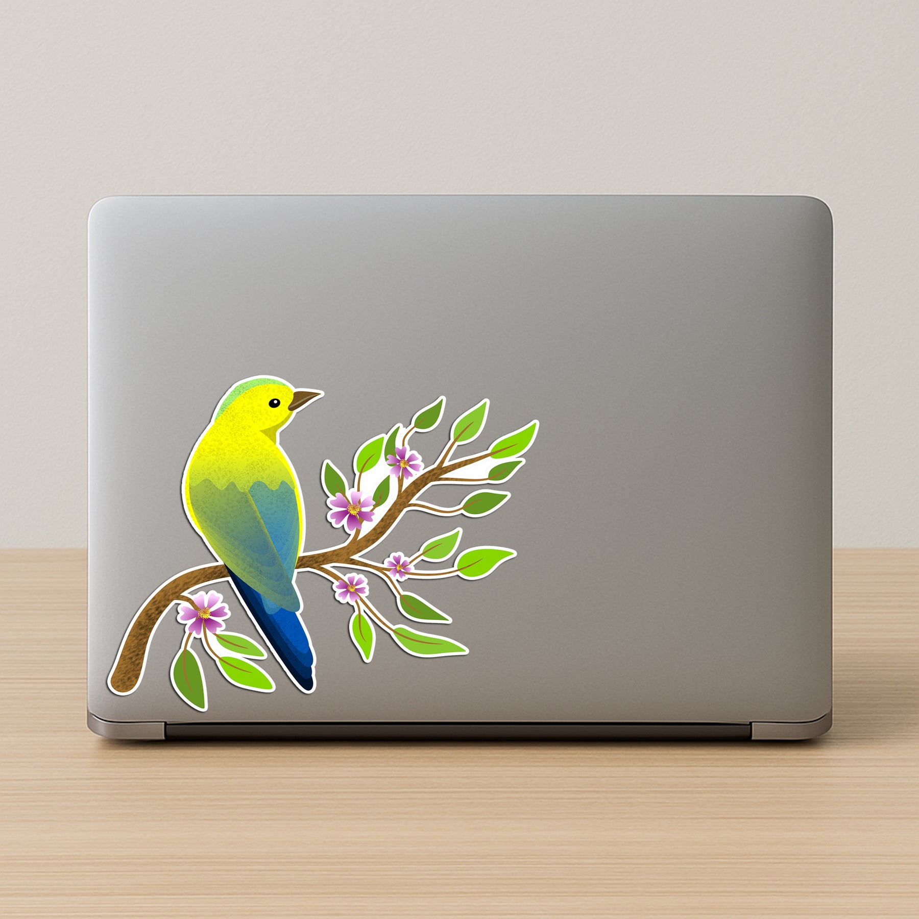 Let your creativity take flight with this vibrant yellow-green songbird sticker perched gracefully on a blooming branch. With its mix of cool and warm tones, this sticker adds a joyful, springtime feel to any surface — perfect for decorating laptops, diaries, bottles, or even room corners.
