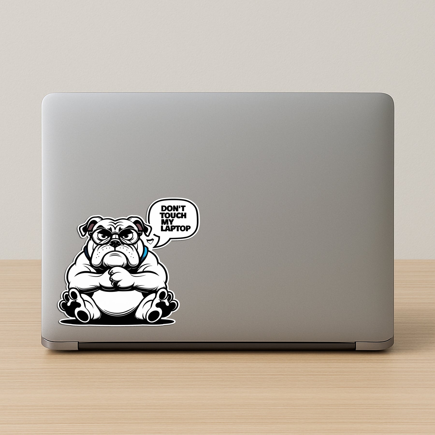 Let this grumpy bulldog guard your tech like a true alpha! This "Don’t Touch My Laptop" vinyl sticker adds attitude, humor, and protection to your laptop. Featuring a bold cartoon bulldog with serious no-nonsense energy, it’s perfect for pet lovers, students, and office rebels who don’t want anyone messing with their space.