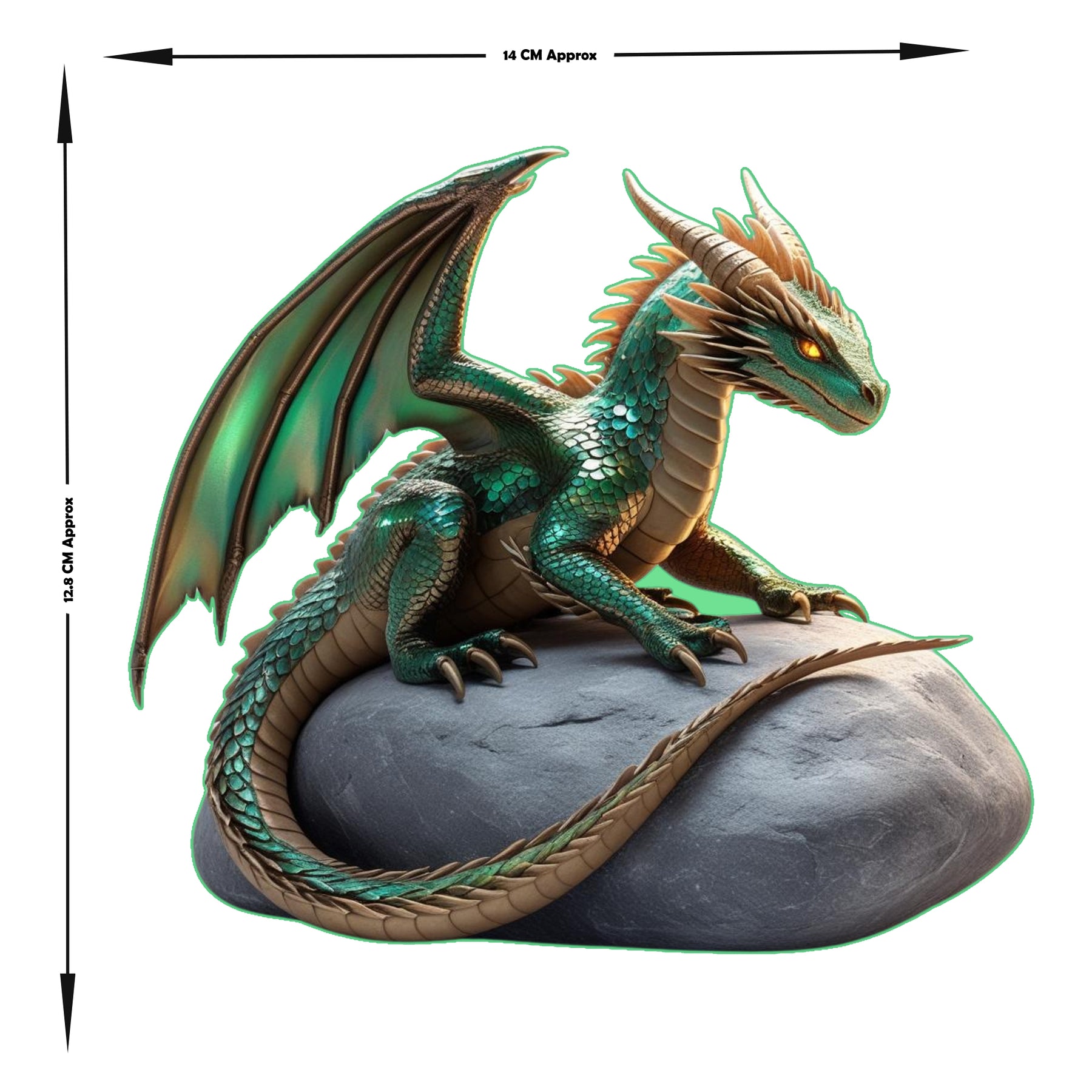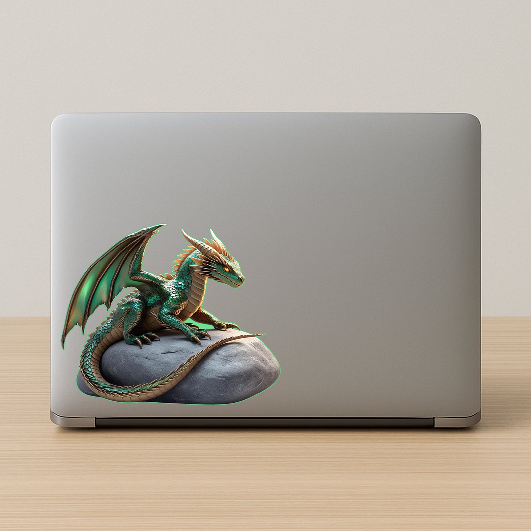 Unleash the beast with this majestic green dragon sticker! Featuring shimmering emerald scales, glowing eyes, and massive wings perched atop a rock, this fantasy decal brings legendary power to your gadgets and gear.