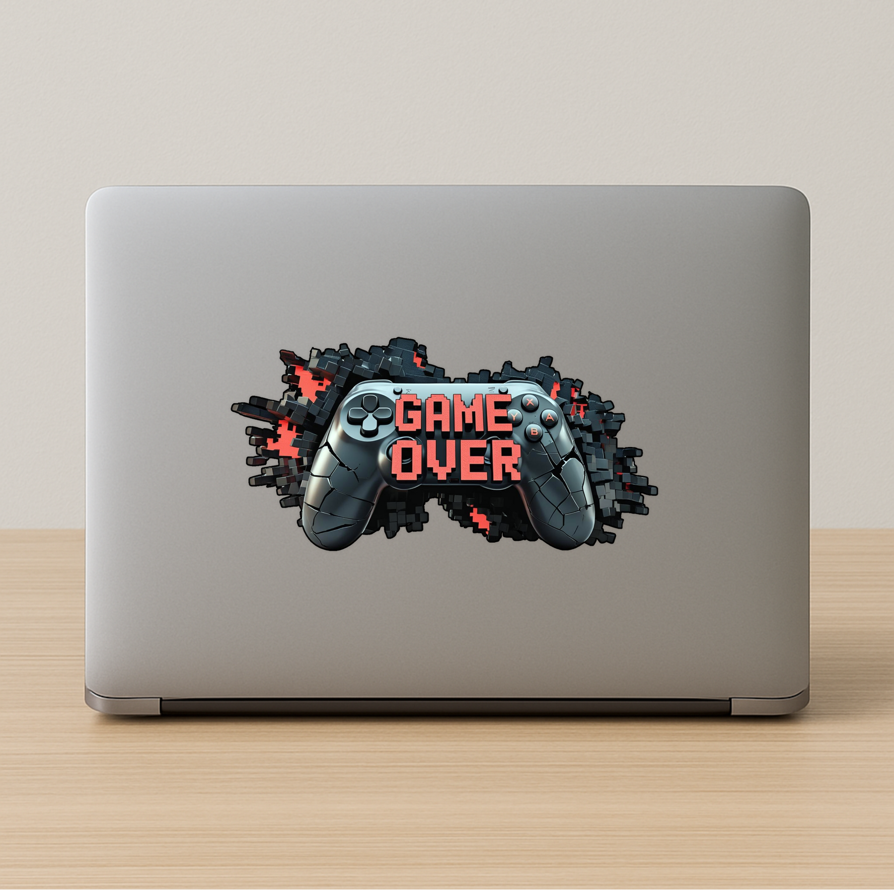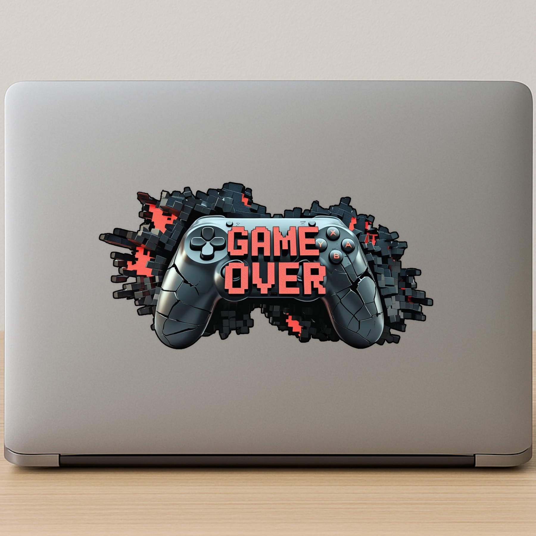 Level up your gear with this STIXY™ Game Over Sticker – featuring a cracked gaming controller bursting out of a pixelated background with bold “GAME OVER” text in 3D retro style. Perfect for laptops, desktops, game consoles, notebooks, or even gamer room decor.