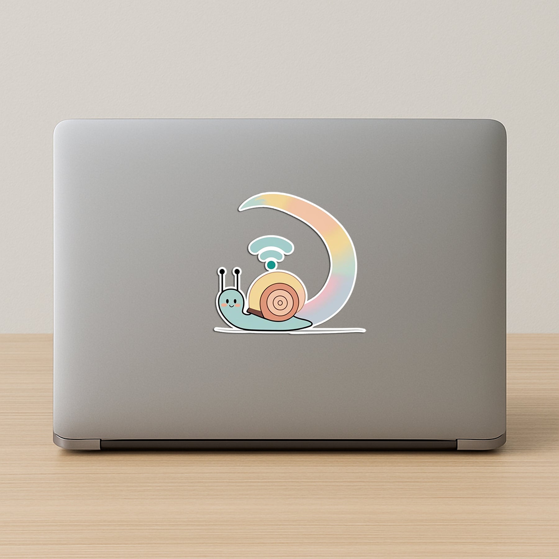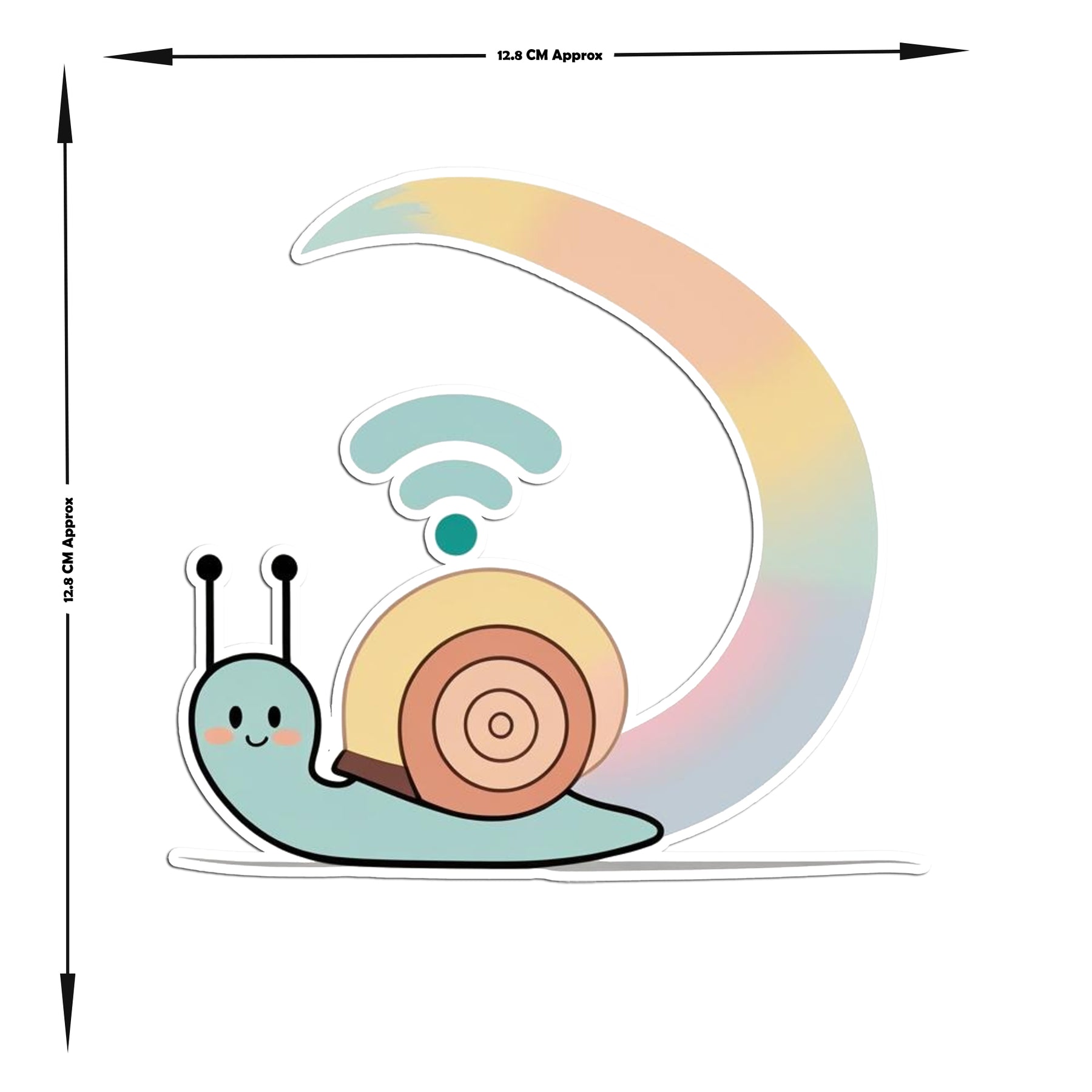 Stuck in buffering mode? This adorable sticker blends tech humor with cute design — a happy snail carrying a WiFi signal on its shell, leaving behind a pastel internet trail. It’s the perfect expression of your slow internet struggles (or personality!).