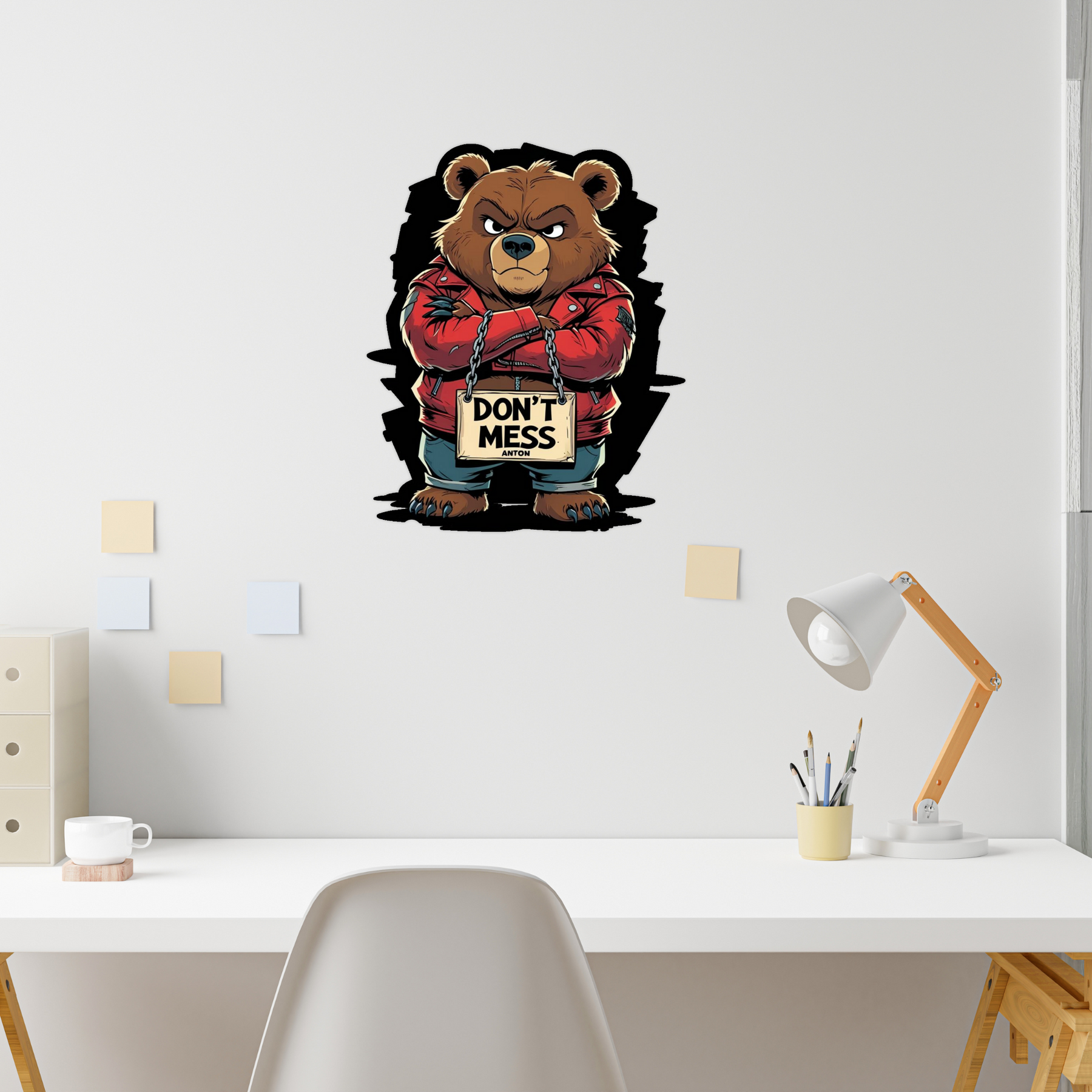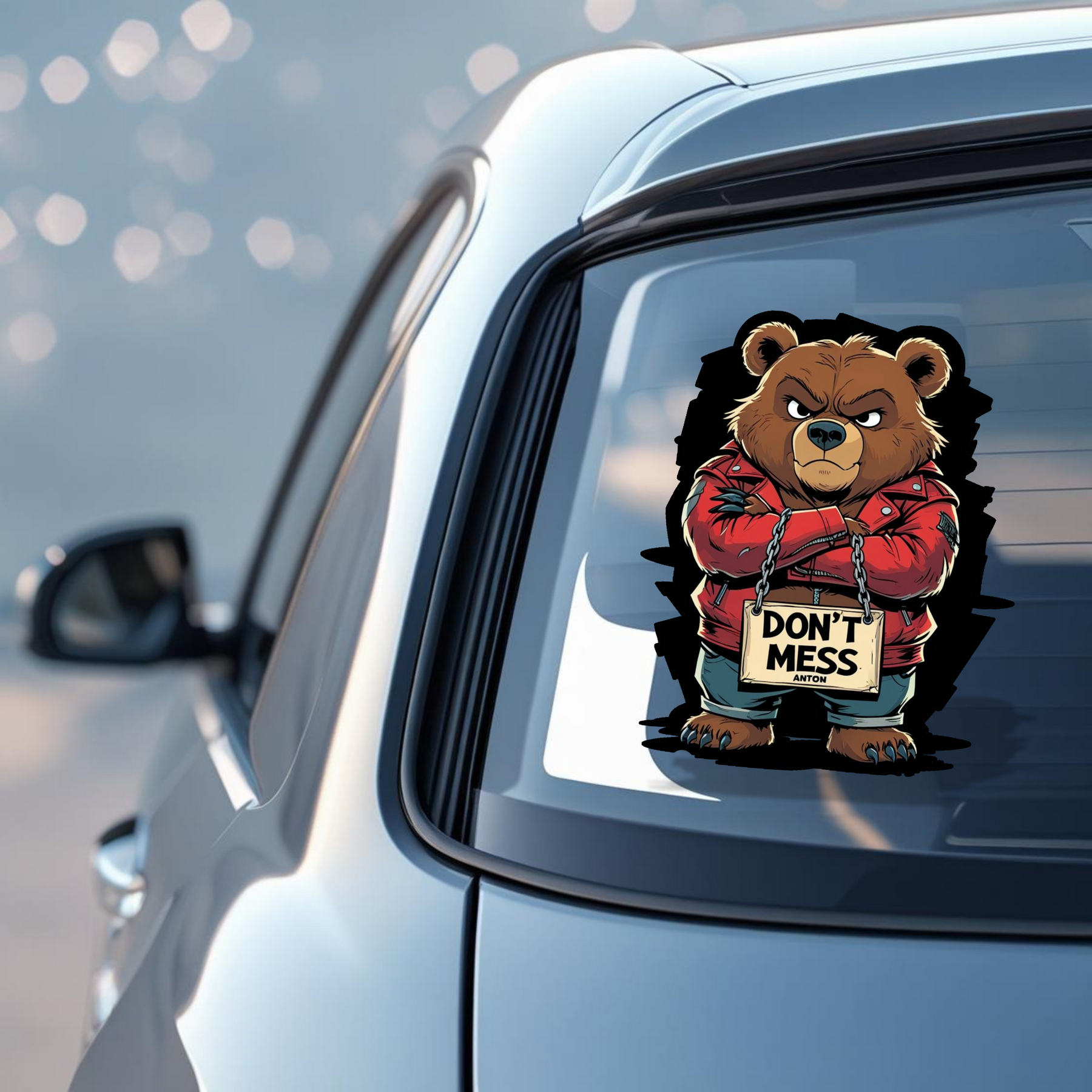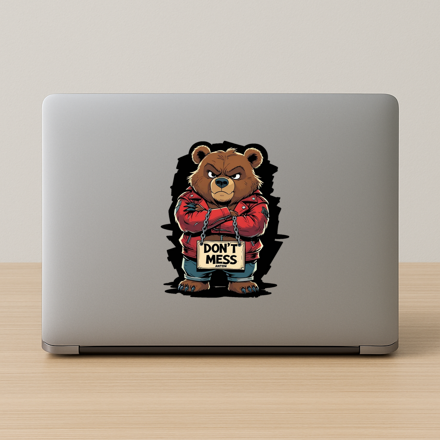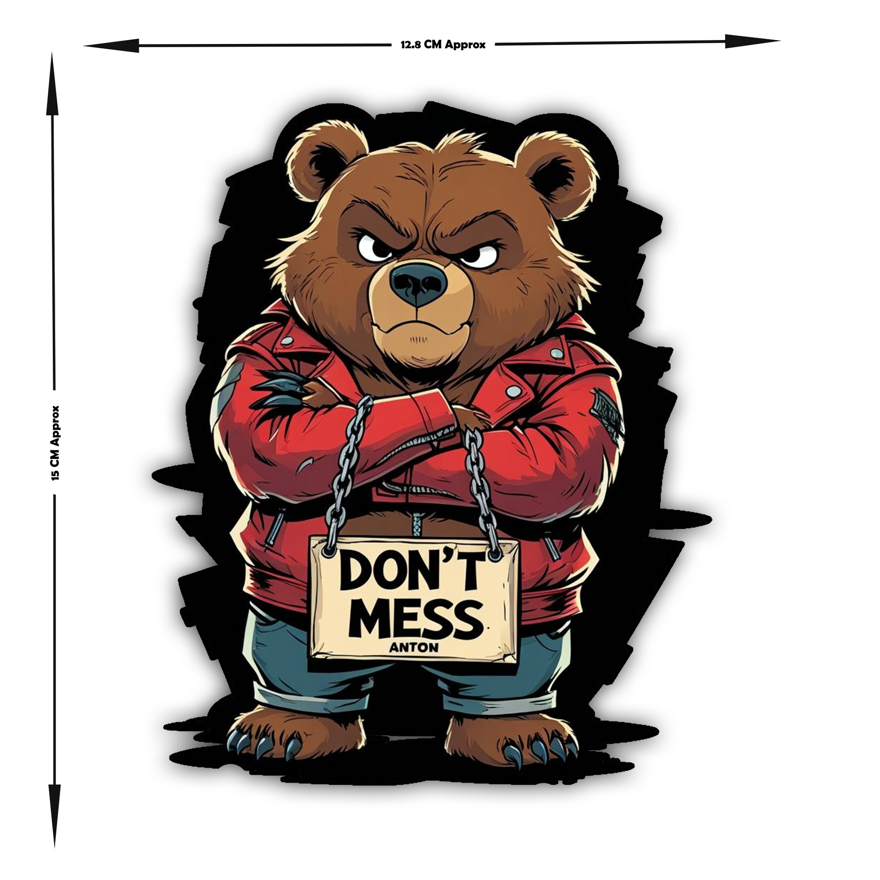 Add fierce attitude to your space with the Don’t Mess Anton Bear sticker – a bold cartoon bear in a red leather jacket holding a “Don’t Mess” sign. Perfect for those who love edgy, playful vibes on their laptop, bike, car, or bottle. This waterproof vinyl sticker sticks strong and makes a statement wherever you place it — ideal for school gear, office desks, or tough mood décor.