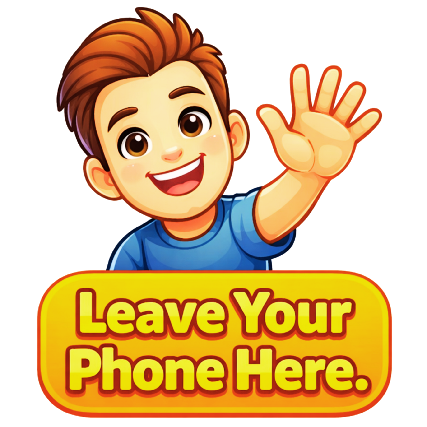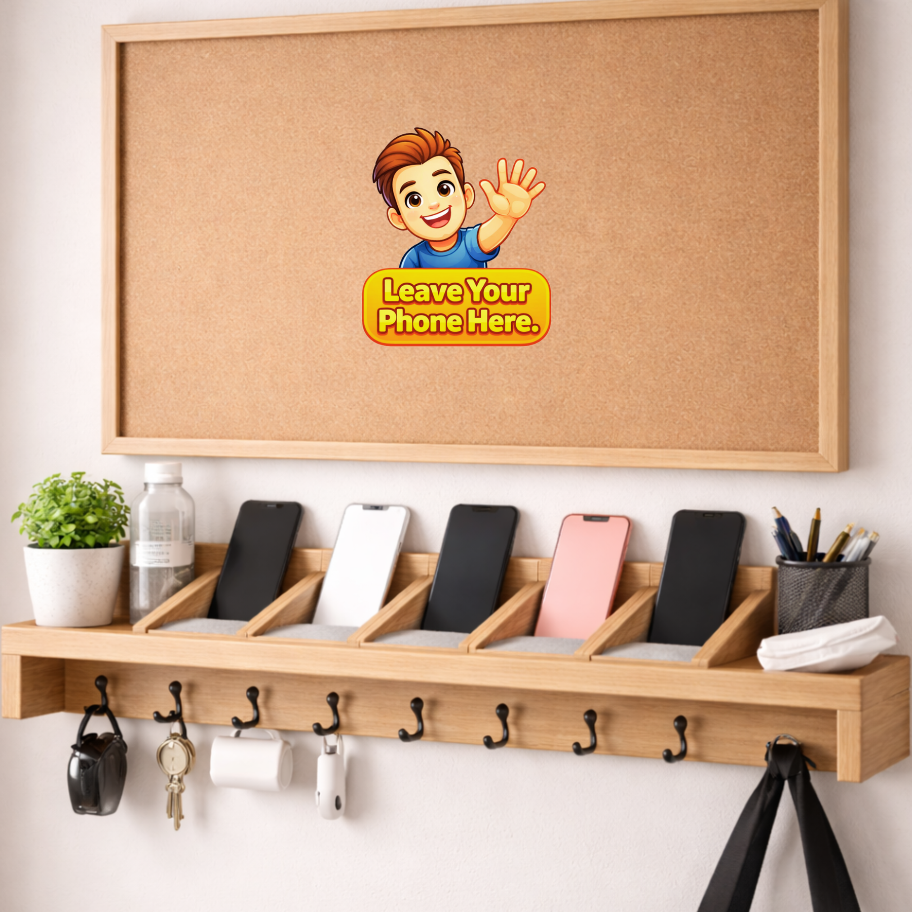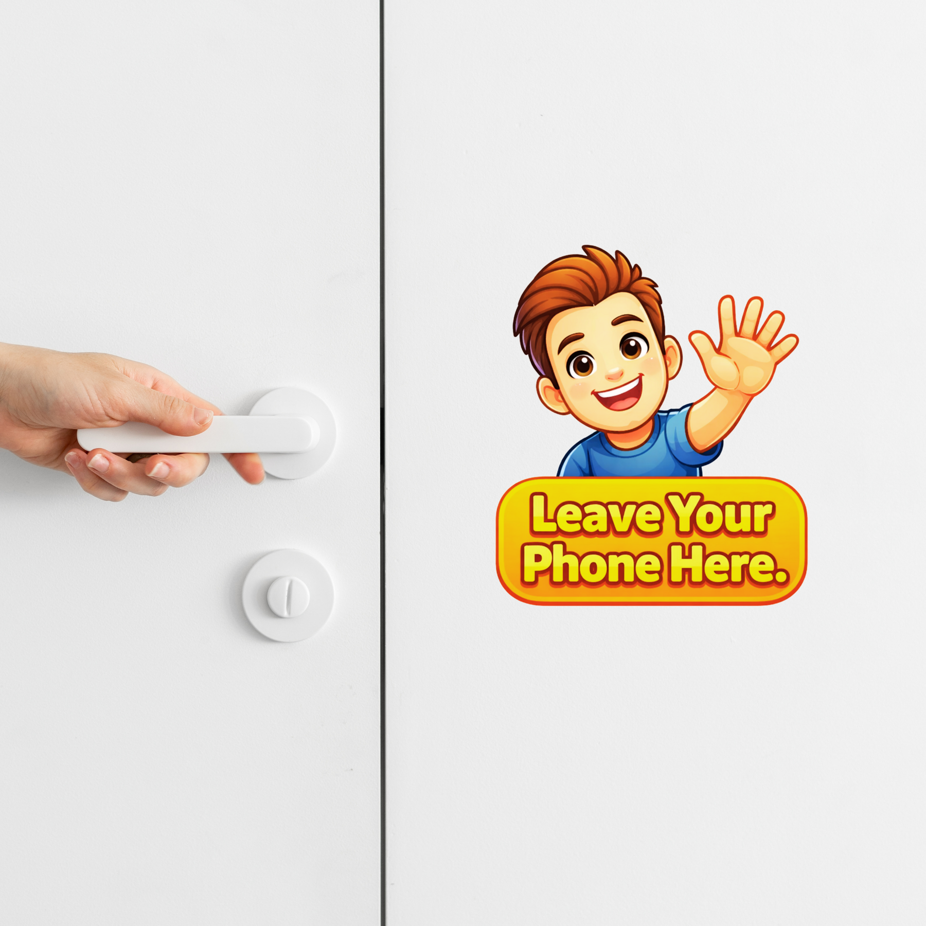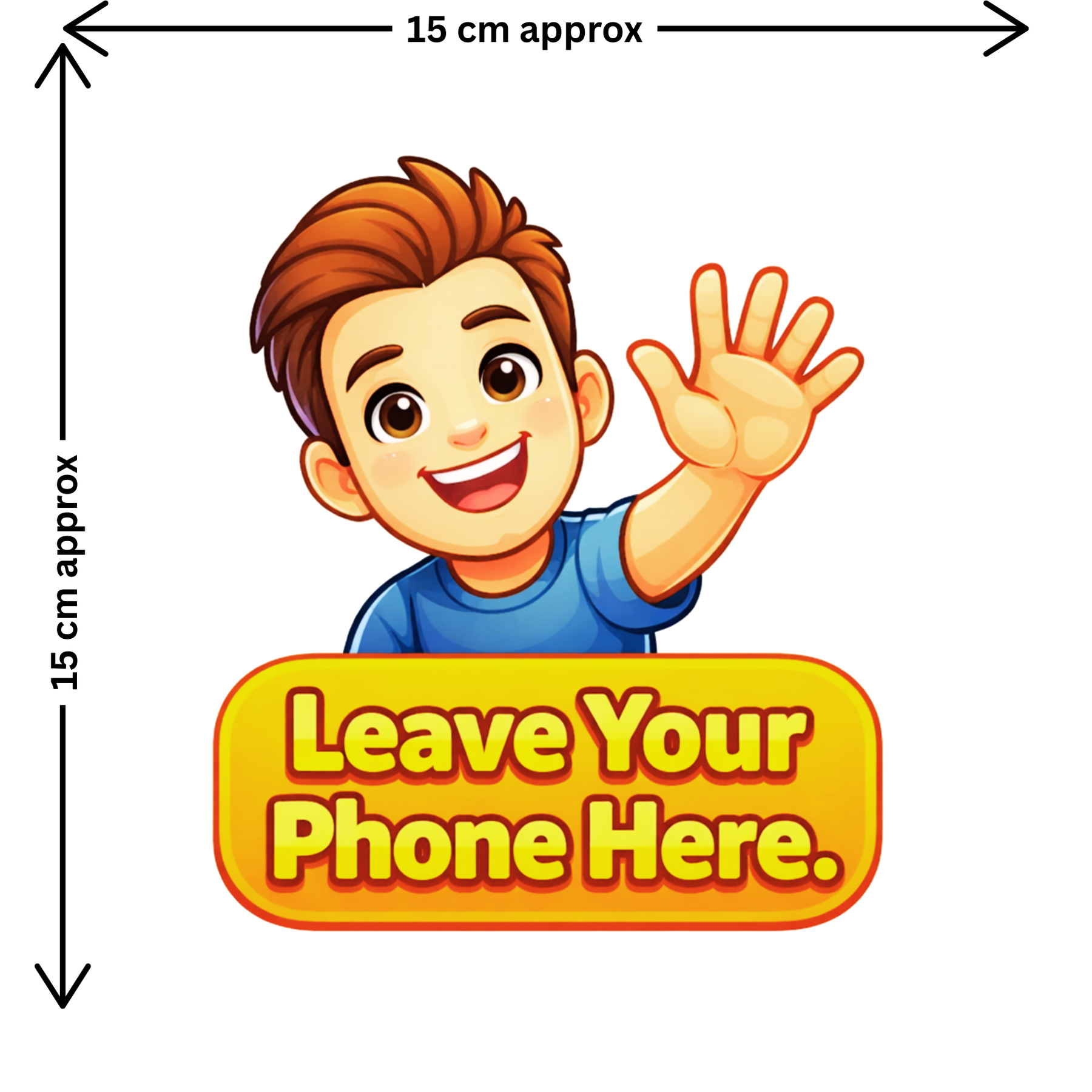 Leave Your Phone Here – Waterproof Matte Sticker is a clear, friendly, and effective reminder designed for phone-restricted or phone-deposit areas. Featuring a cheerful illustrated character with a welcoming gesture, this sticker encourages users to leave their mobile phones politely without sounding strict or aggressive. With an approximate size of 15 cm × 15 cm, it is highly visible and easy to understand at first glance.