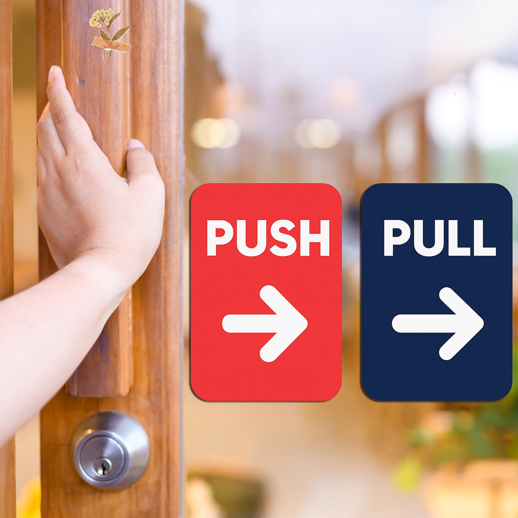 Make every door action unmistakably clear with our premium Push Pull Direction Sticker Set! Featuring a clean, bold design in vibrant red and navy, these stickers offer high visibility and instant recognition. Ideal for shops, cafes, offices, glass doors, and restaurants, they are waterproof, durable, and leave no sticky residue upon removal.