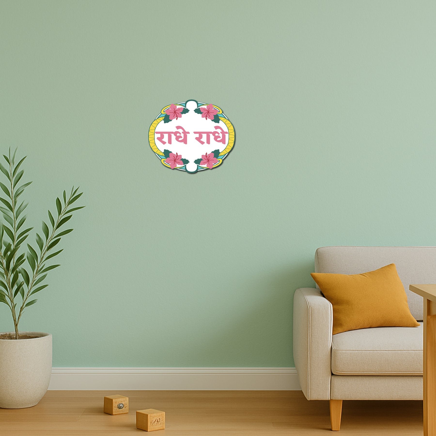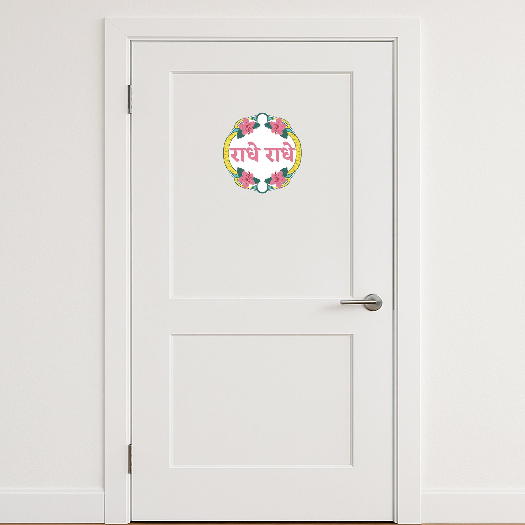 Celebrate devotion with the Radhe Radhe spiritual wall sticker or decal. Featuring vibrant floral designs surrounding the sacred words Radhe Radhe, this sticker is perfect for prayer rooms, temples, or as a meaningful gift. The vibrant colors and traditional design will add a divine touch to your space. Printed on premium vinyl, this waterproof sticker is both durable and easy to apply, making it perfect for anyone who loves spiritual art.