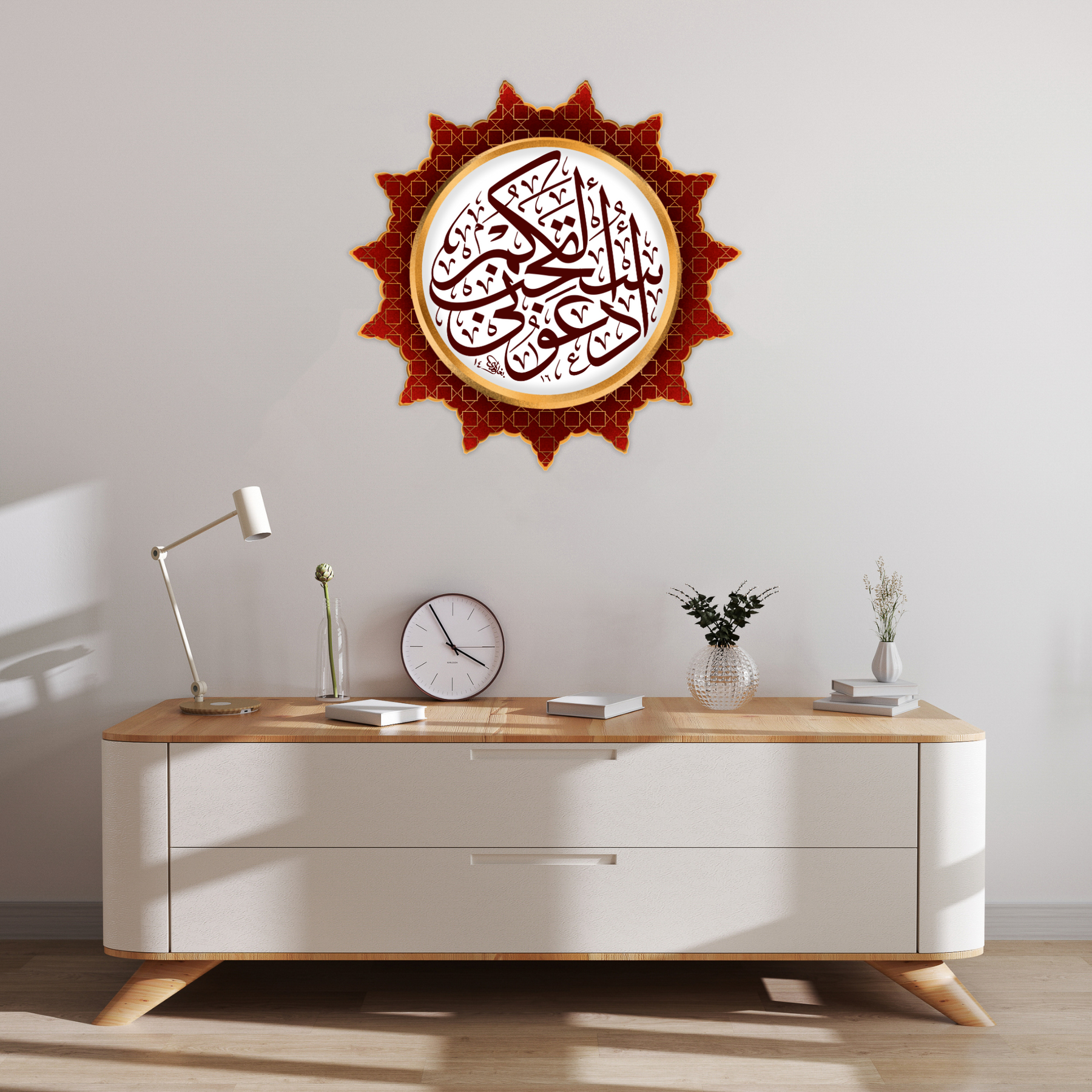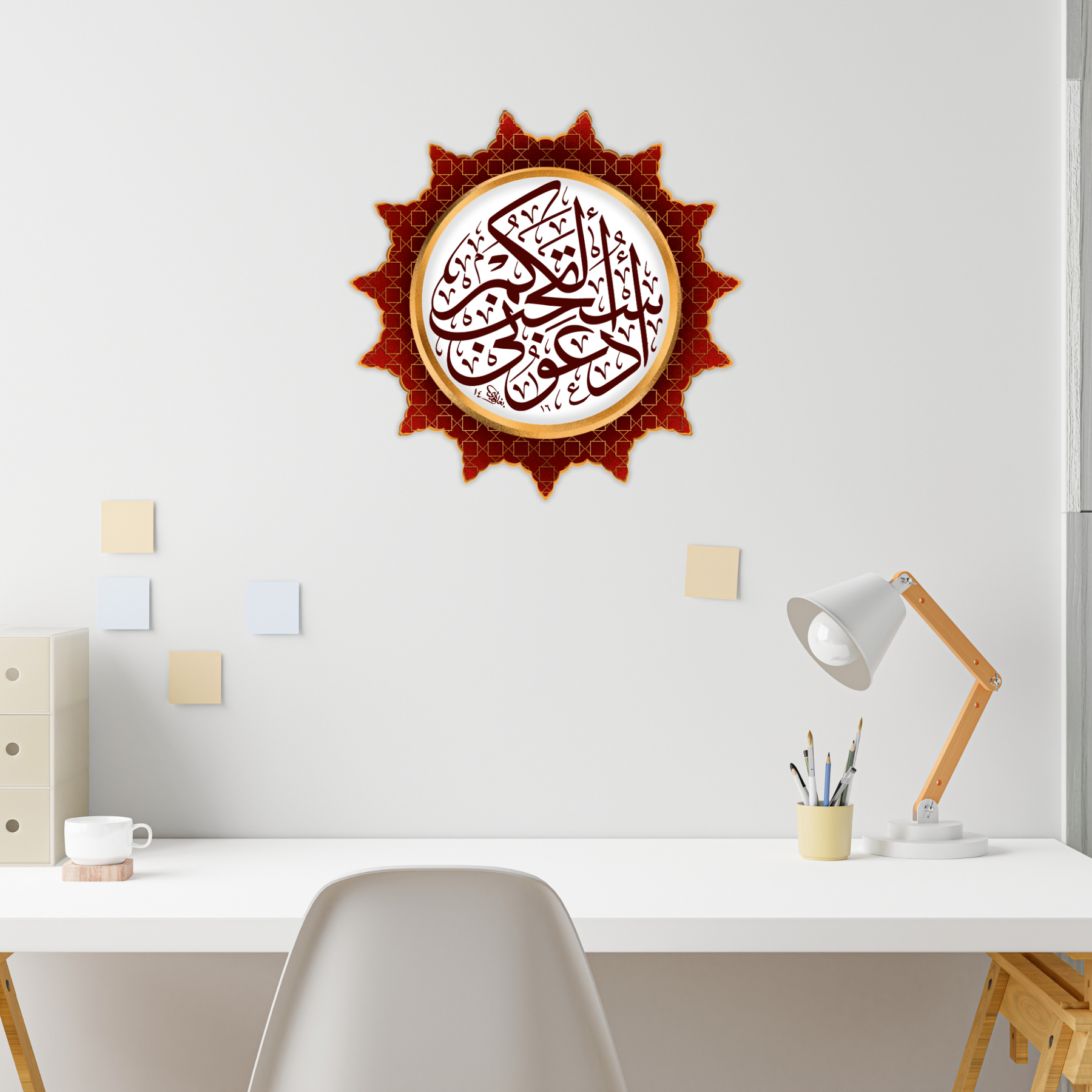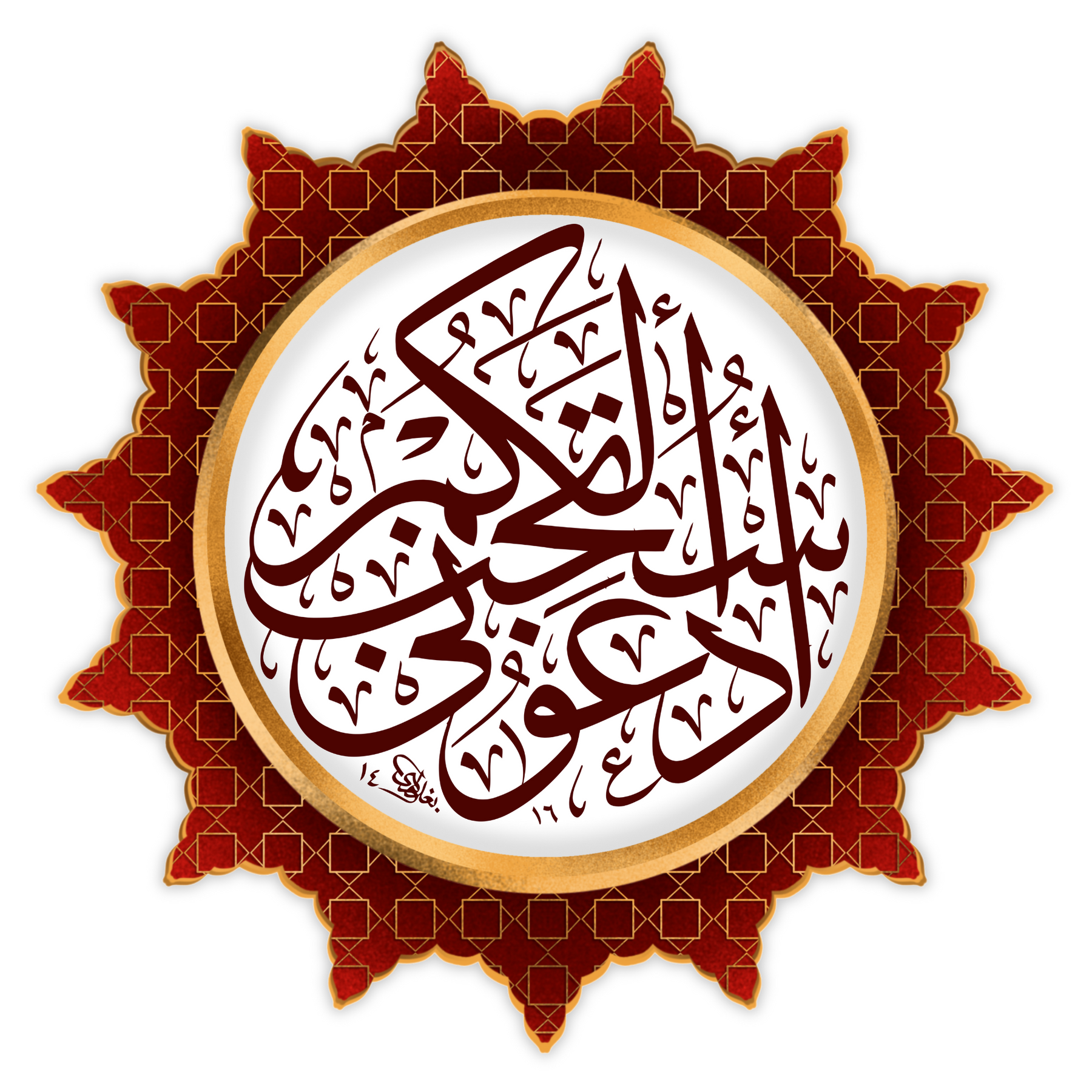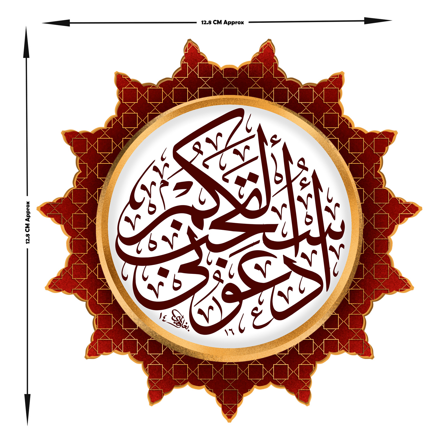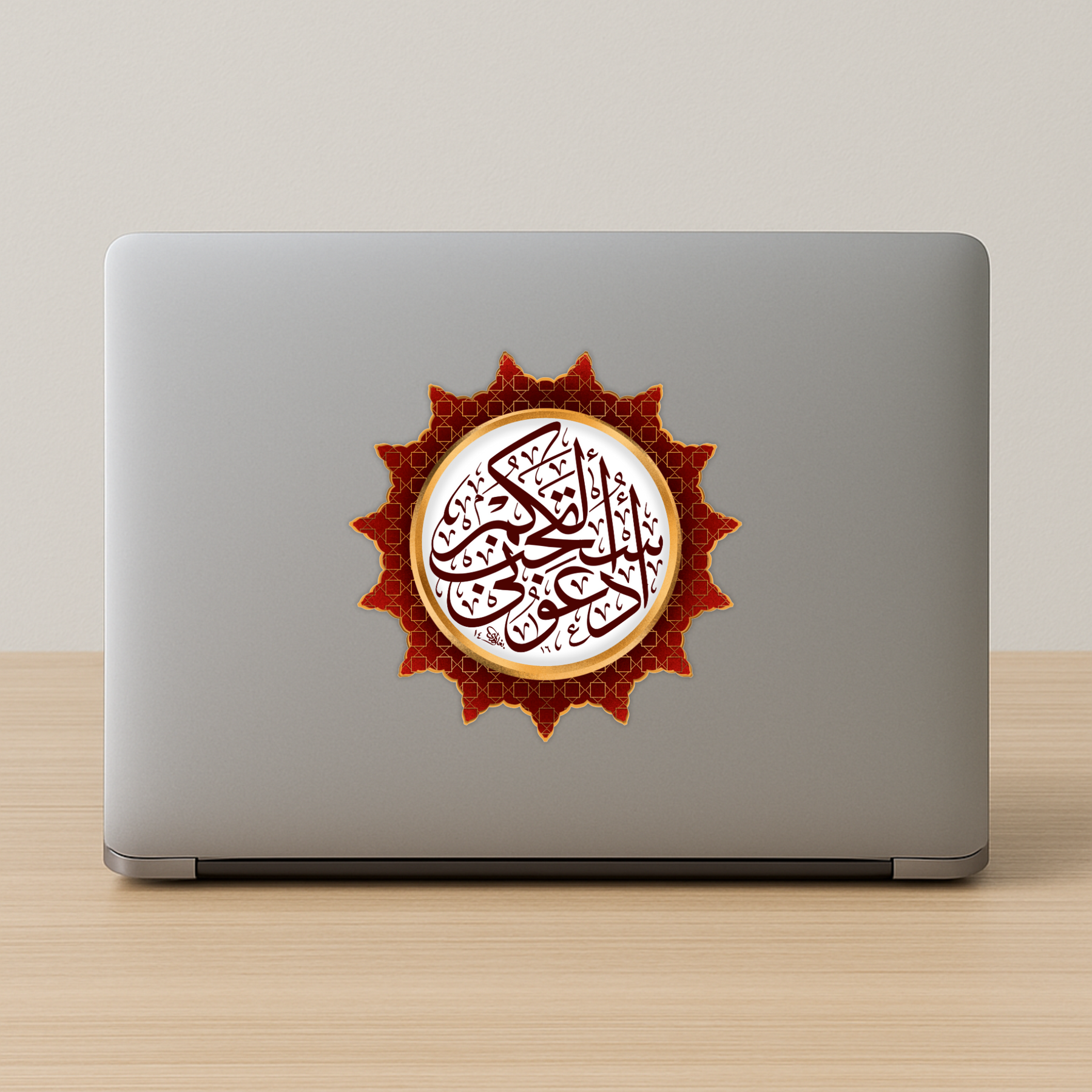 Add a powerful reminder of faith with this vibrant Quranic Dua sticker in rich red and gold, featuring elegant Arabic calligraphy framed in an ornate pattern. The verse encourages reflection, prayer, and divine connection — making it a perfect addition to mirrors, notebooks, laptops, or entryways.