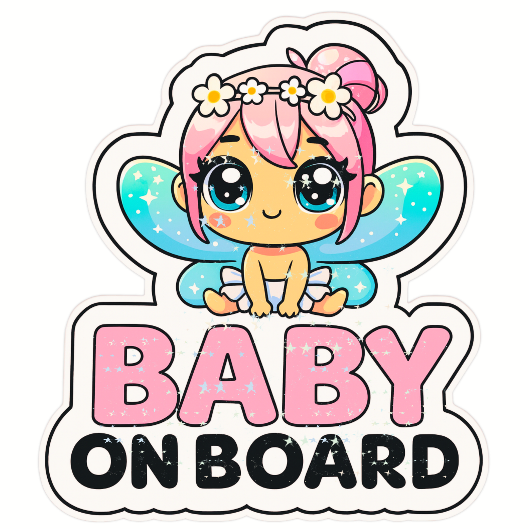 Spread sweetness and safety on the road with the STIXY Baby On Board Sticker, featuring an adorable fairy baby with sparkling pink hair, blue wings, and twinkling glitter details. This cute and attention-grabbing sticker makes sure drivers around you stay cautious while adding a playful, lovable touch to your car or baby gear.