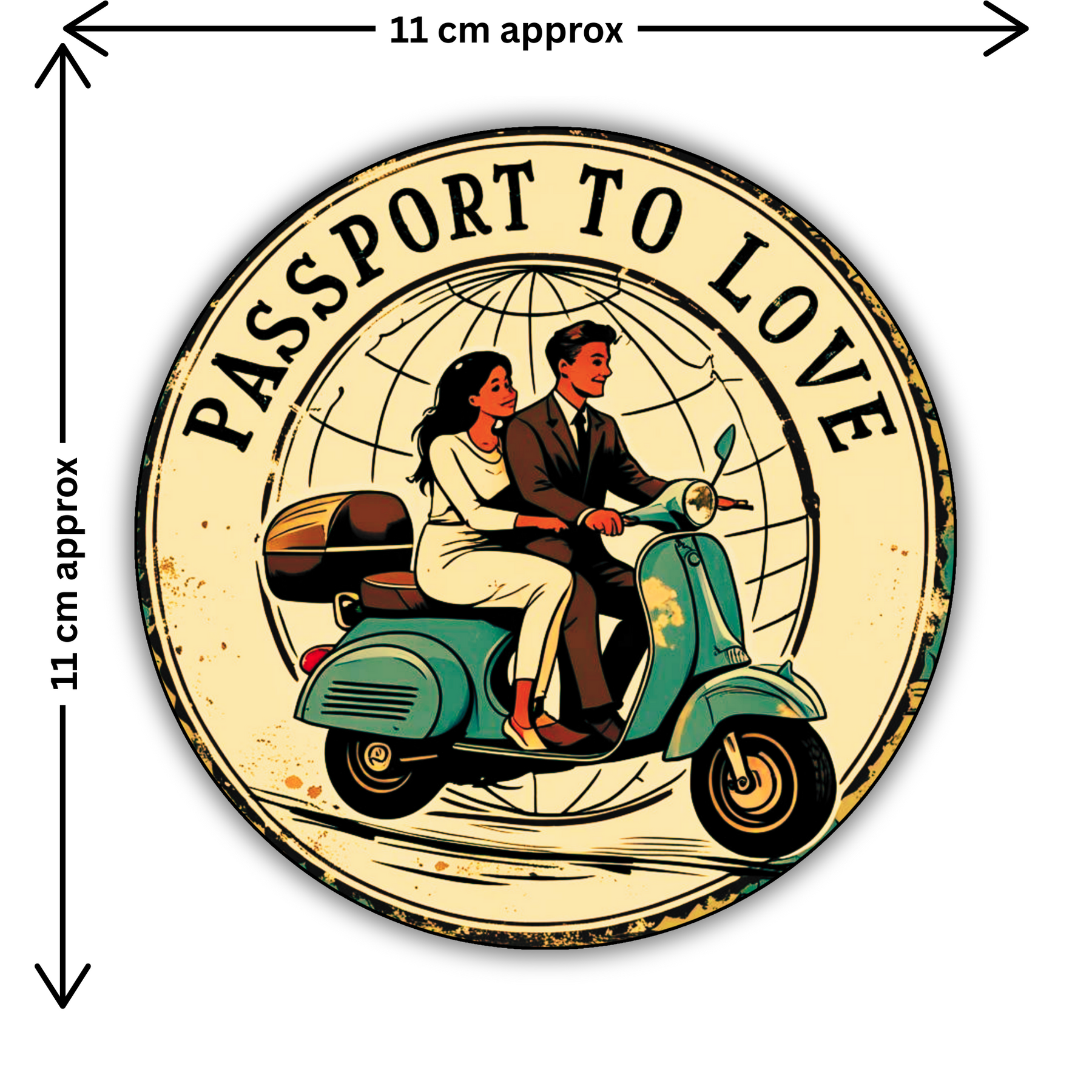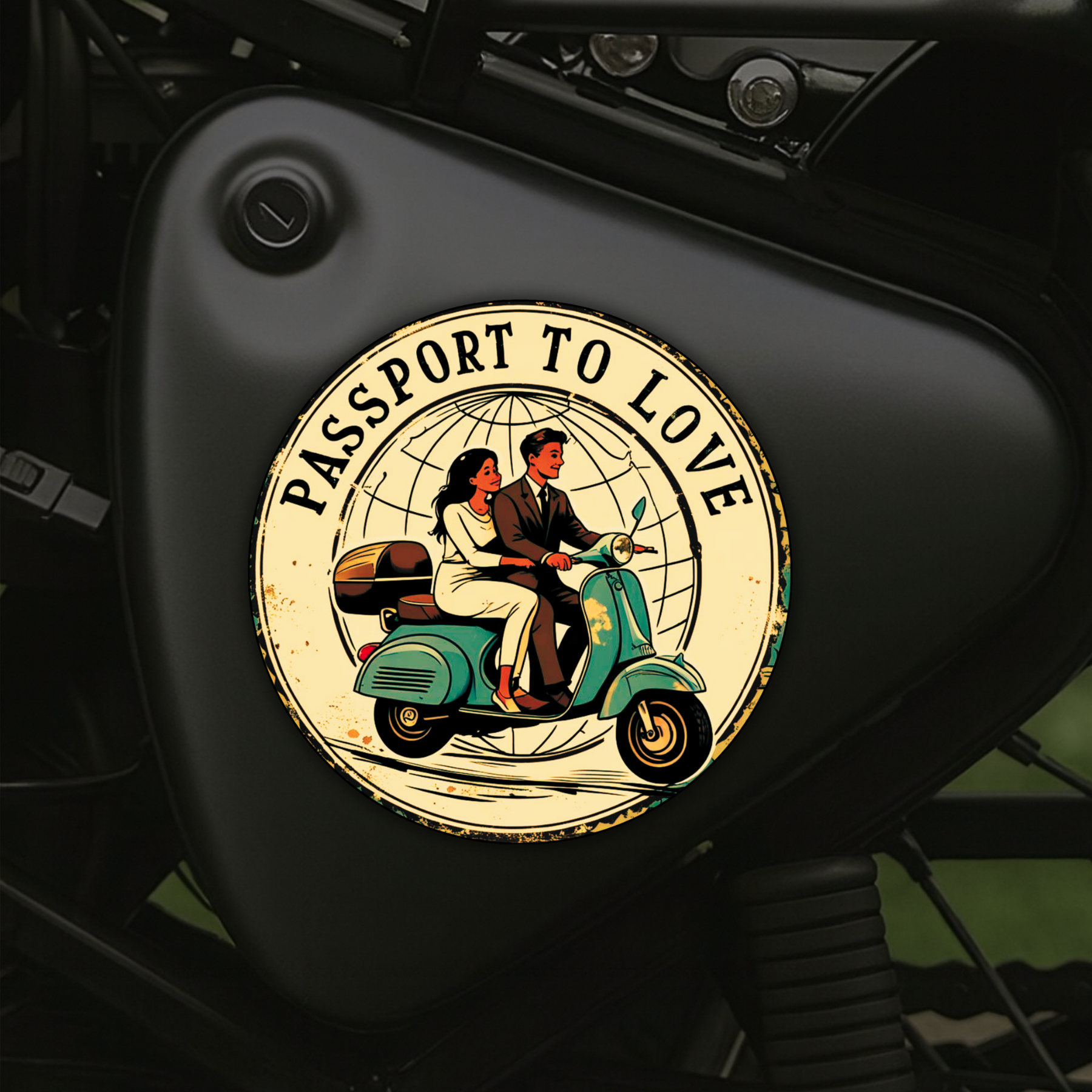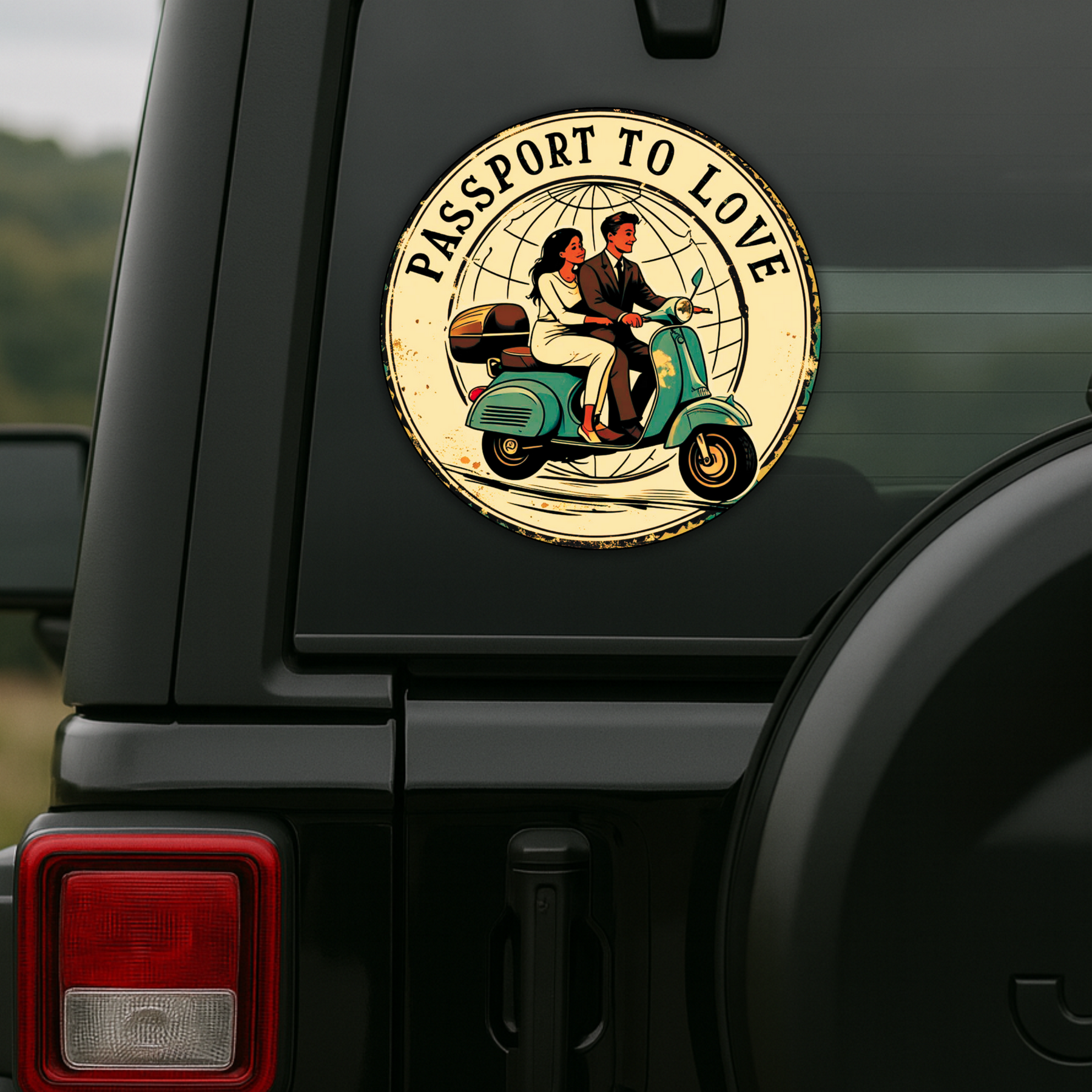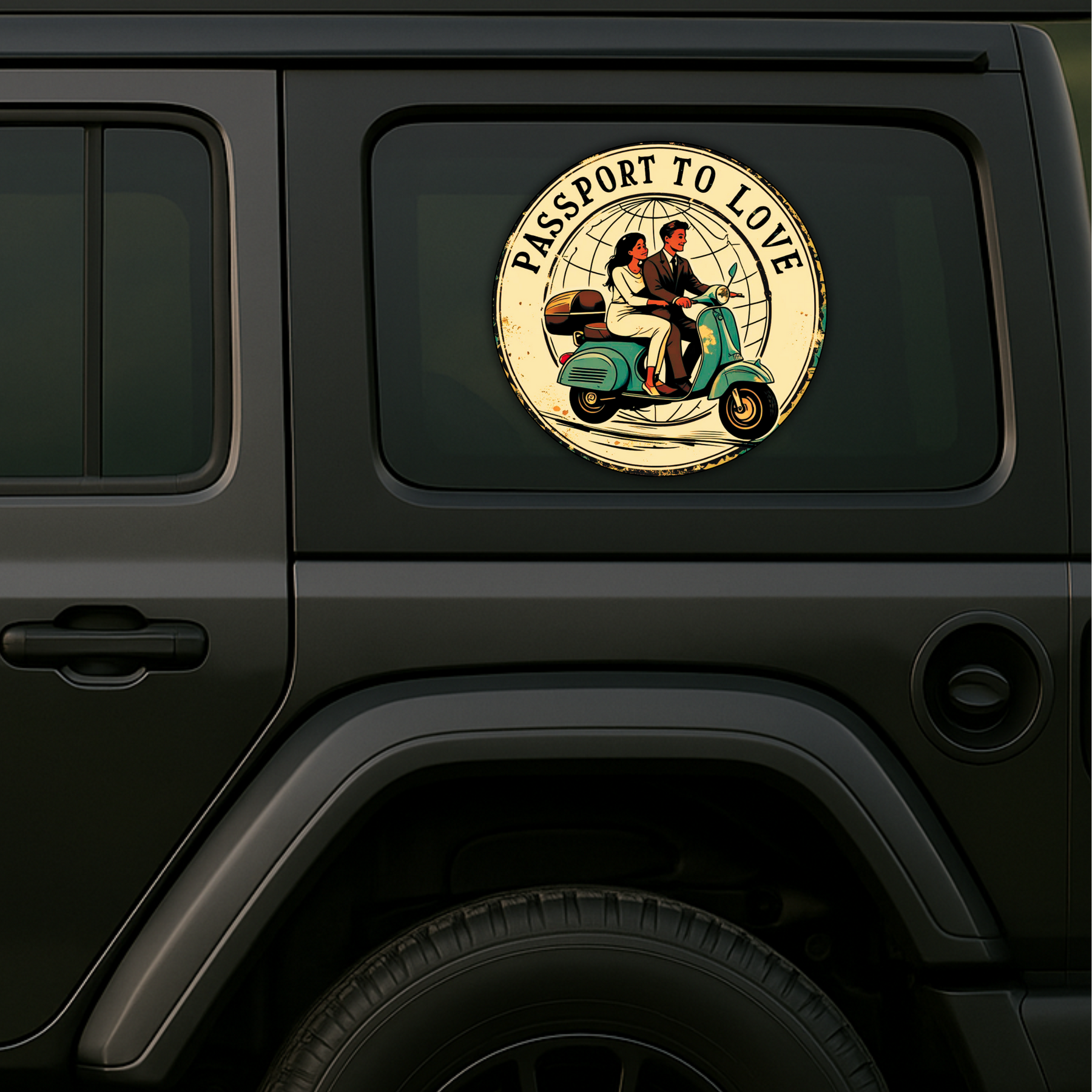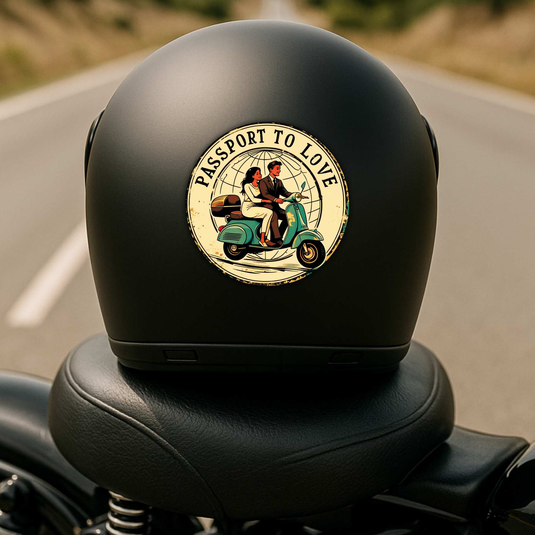Ride into romance with the STIXY Passport to Love Sticker, a vintage-style design celebrating travel, togetherness, and timeless love. Featuring a couple on a classic scooter against a globe backdrop, this sticker beautifully captures the joy of exploring the world hand in hand.