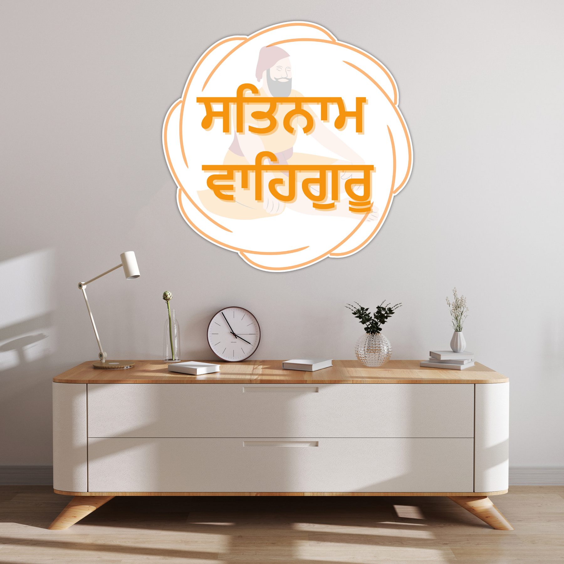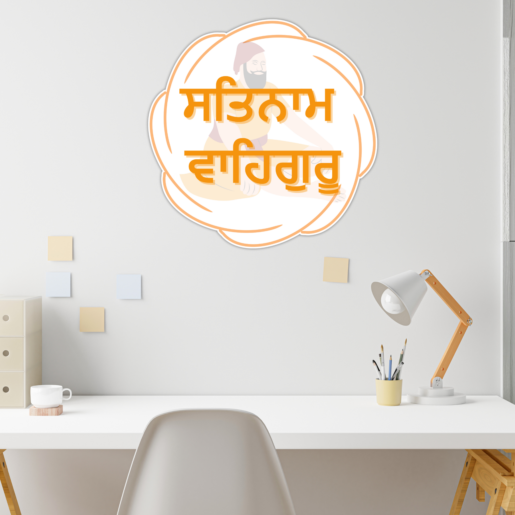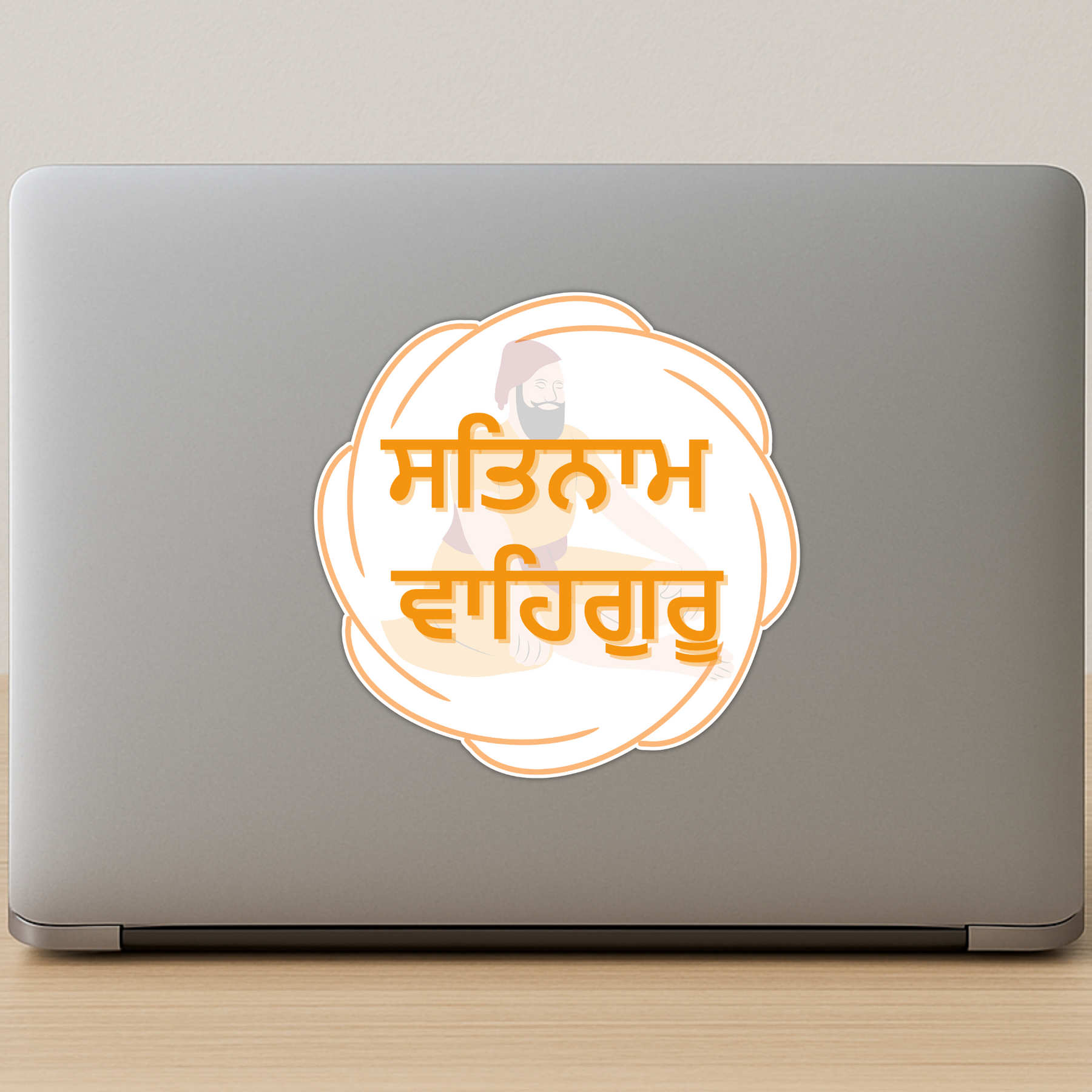 Show your devotion and faith with the STIXY™ Satnam Waheguru Sticker, beautifully designed in vibrant orange Punjabi text with an illustrated spiritual figure in the background. This sacred design is perfect for laptops, home decor, or gifting to loved ones.