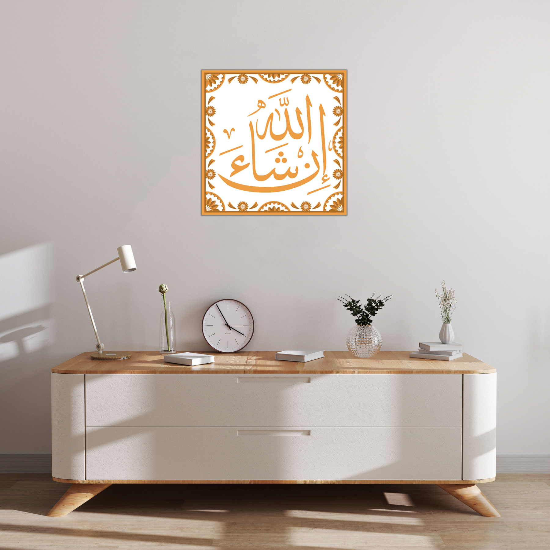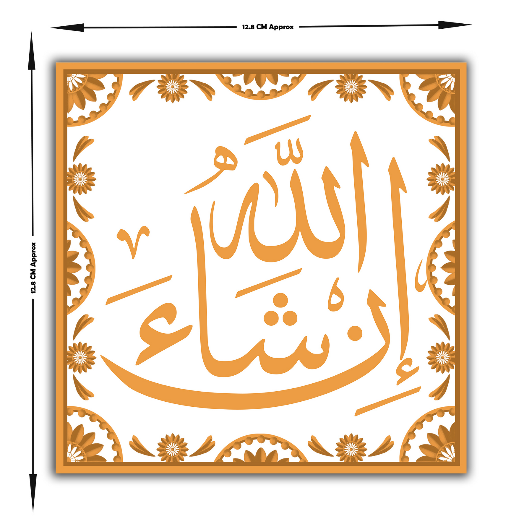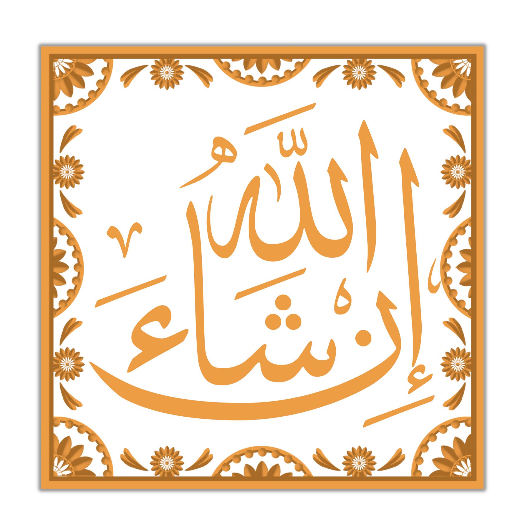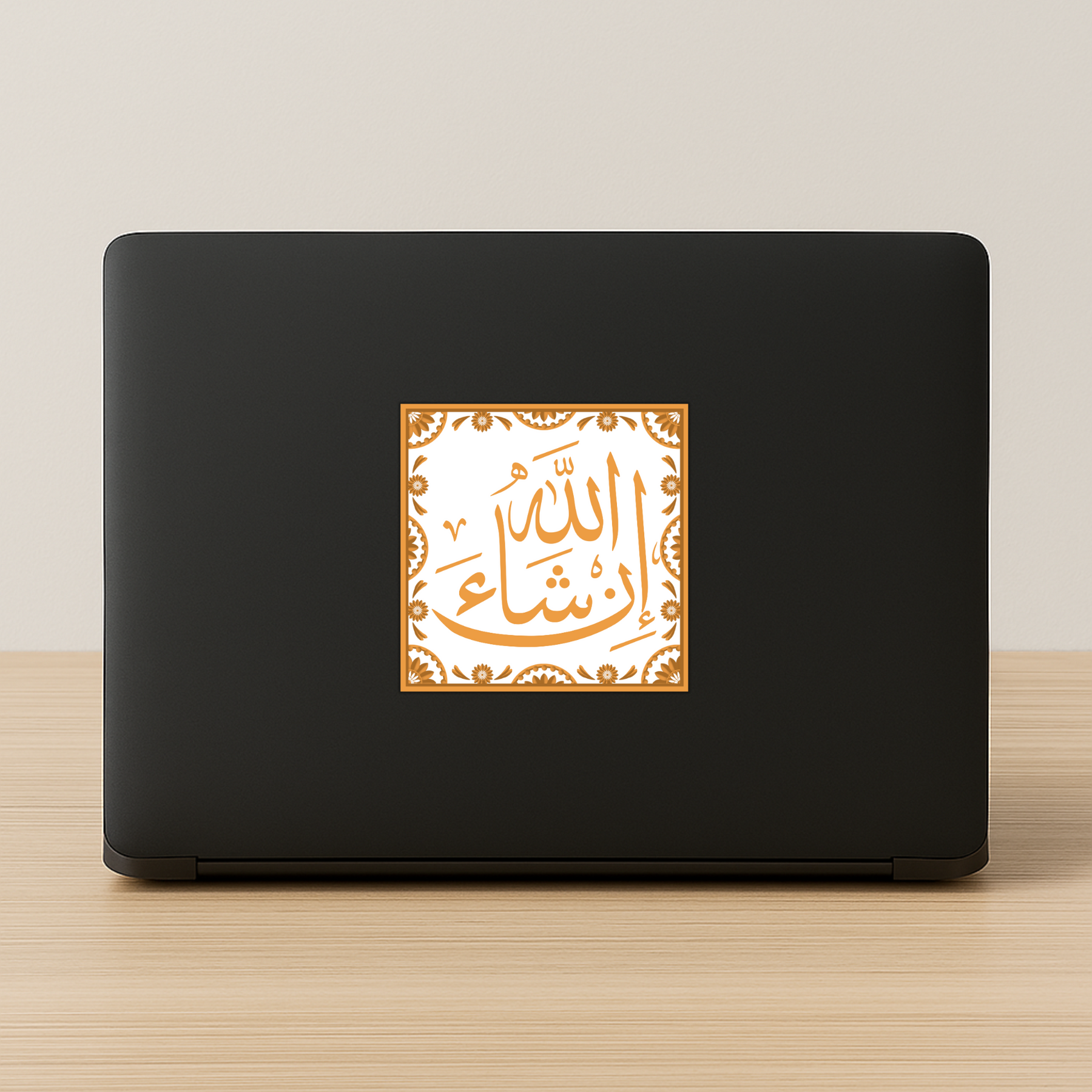 Add divine charm to your space with this "In Shaa Allah" Arabic calligraphy sticker, beautifully accented with a golden floral border. A sophisticated spiritual design for Islamic homes, offices, study areas, and prayer spaces.