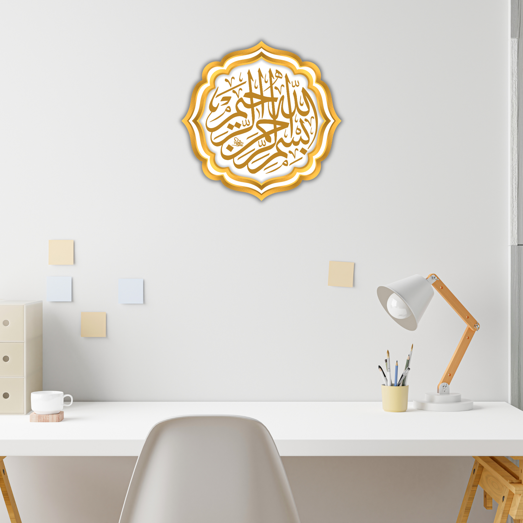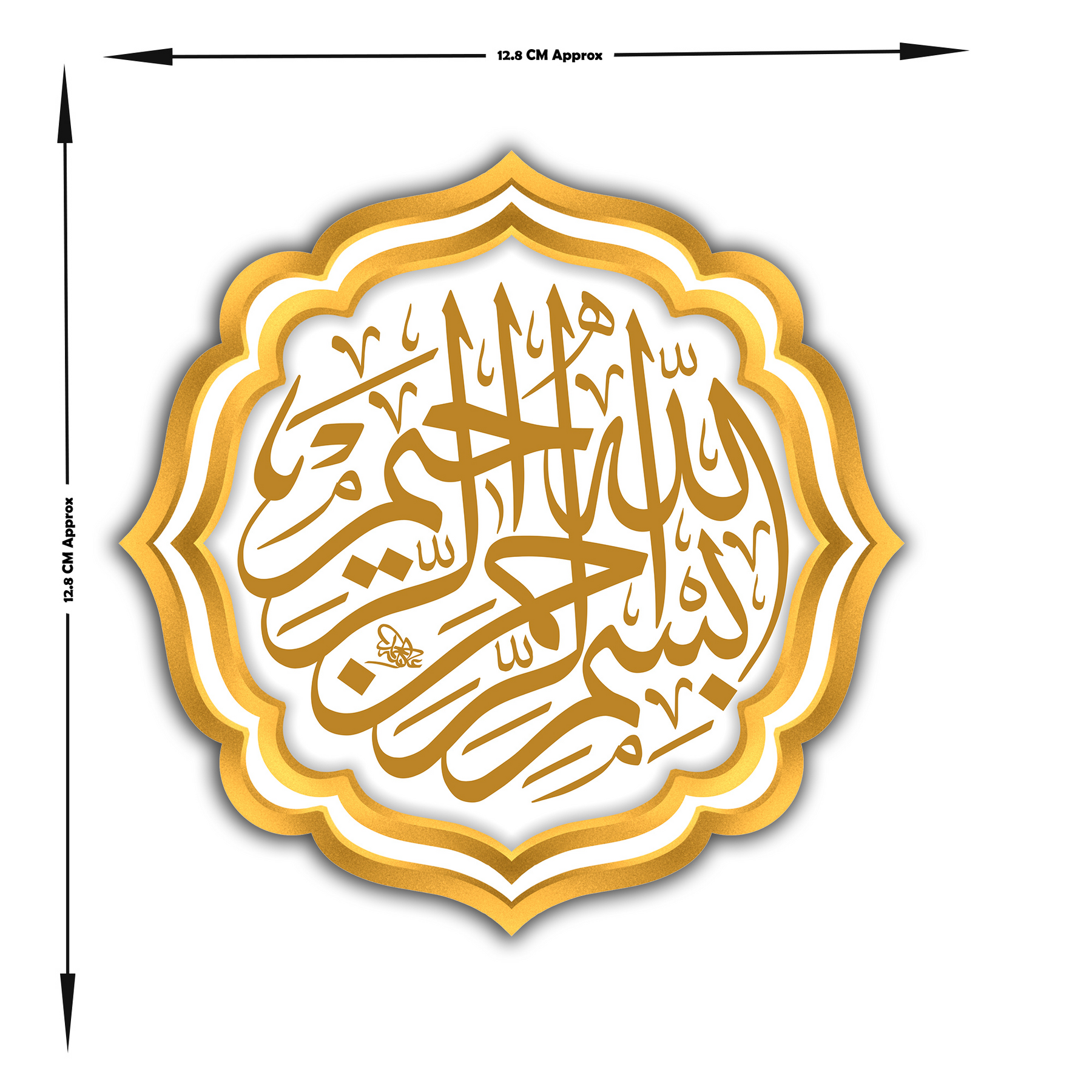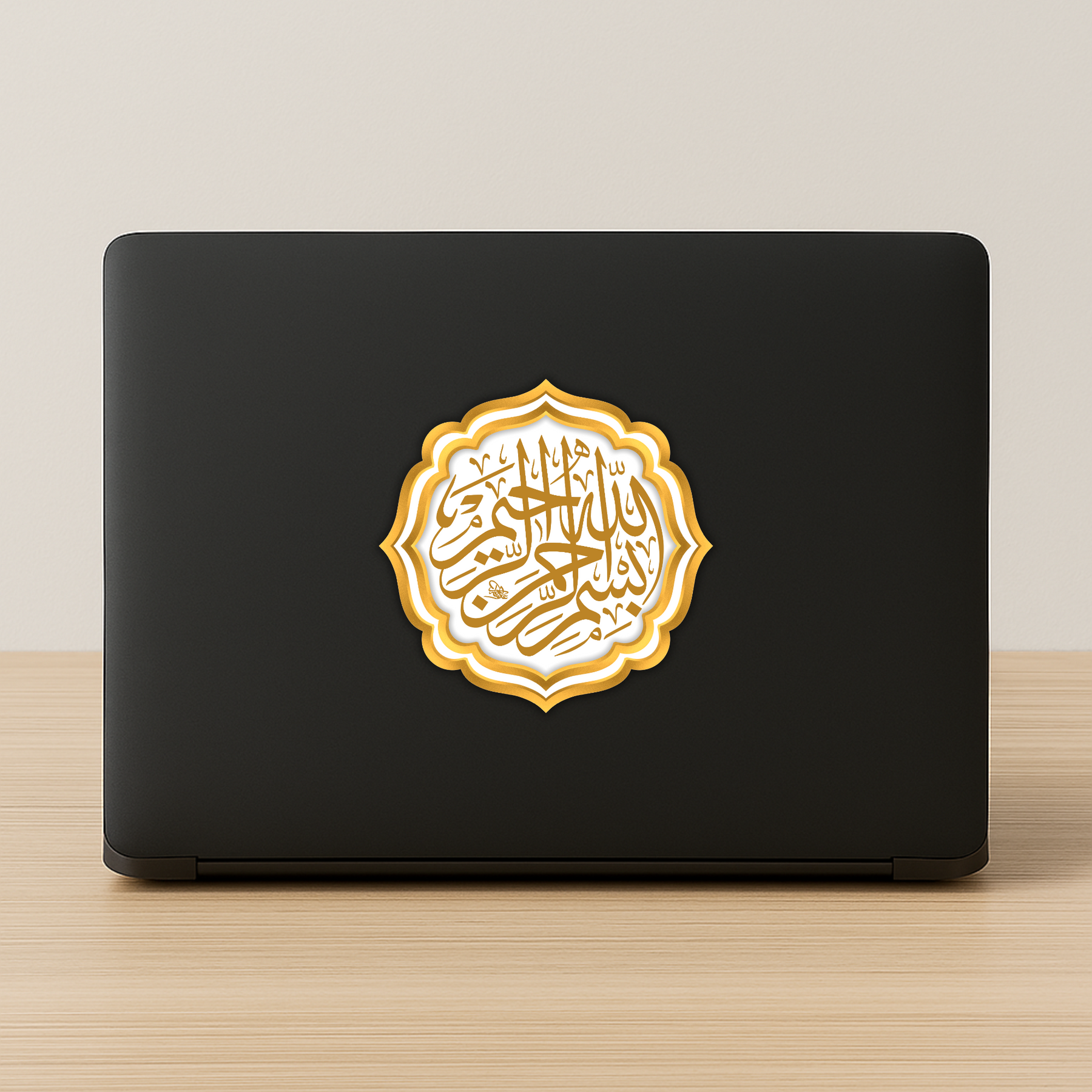Bring divine grace to your everyday spaces with this elegant Bismillah-ir-Rahman-ir-Rahim sticker in intricate golden Arabic calligraphy. The unique floral-edge shape and regal shine make it a stunning addition to laptops, bottles, notebooks, or pooja corners.