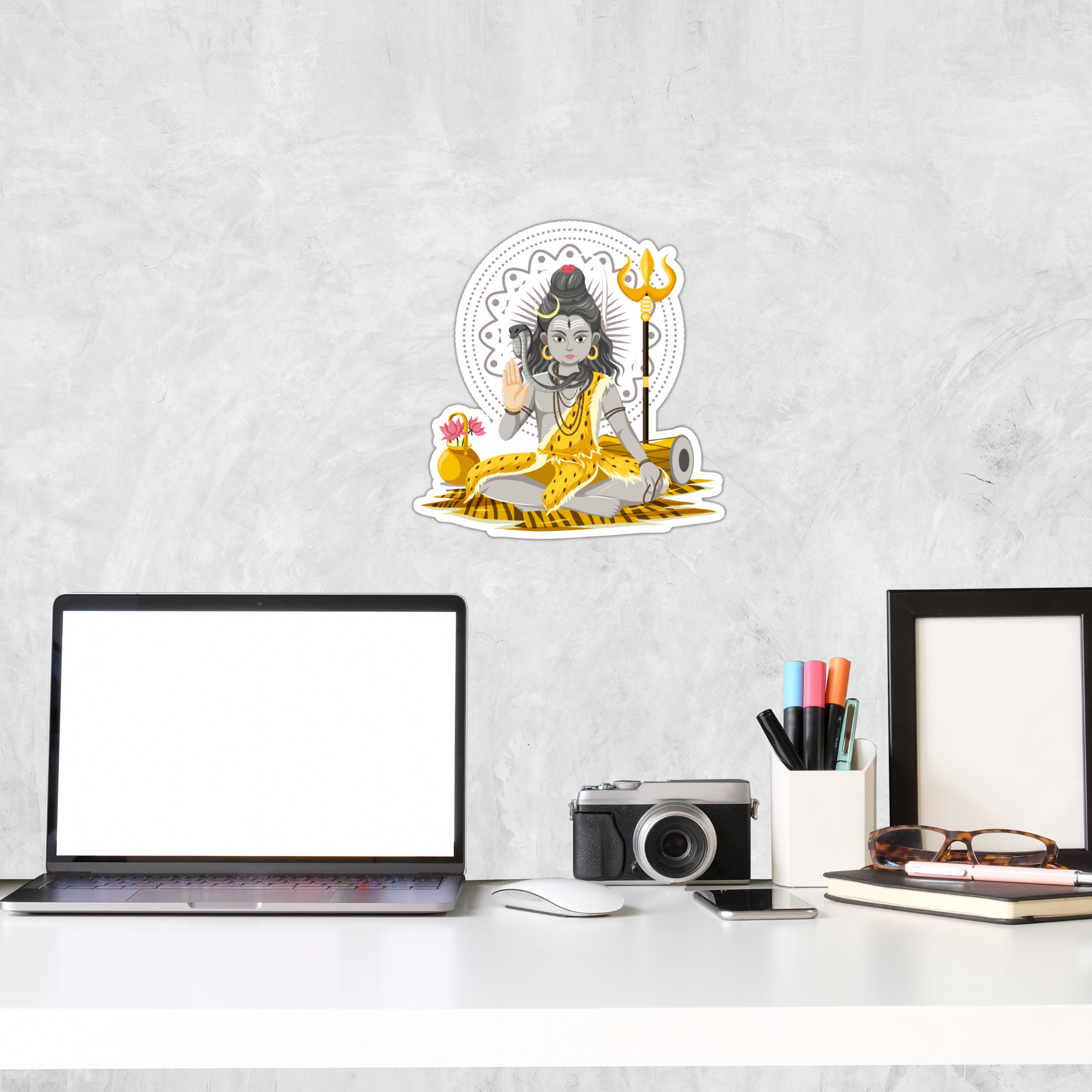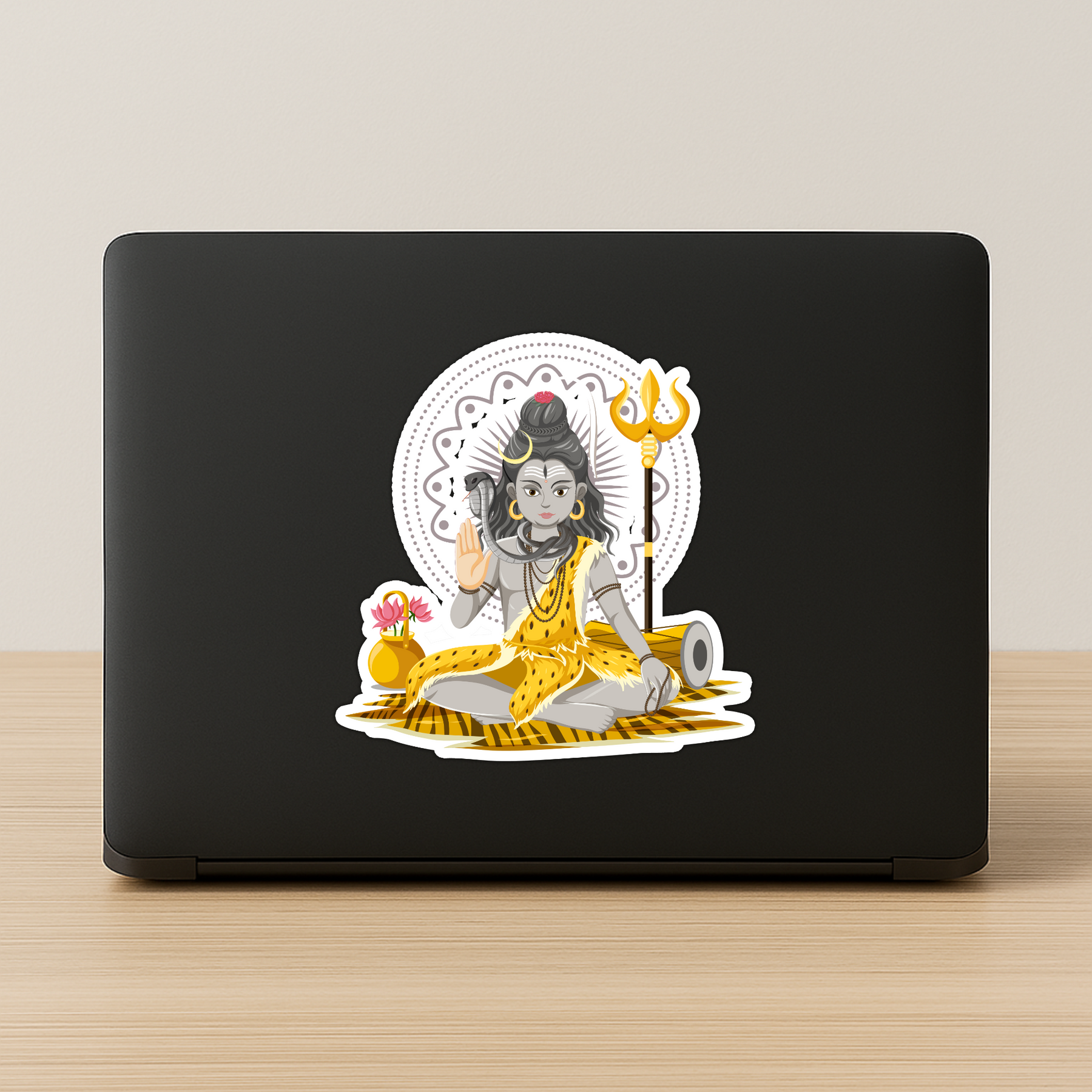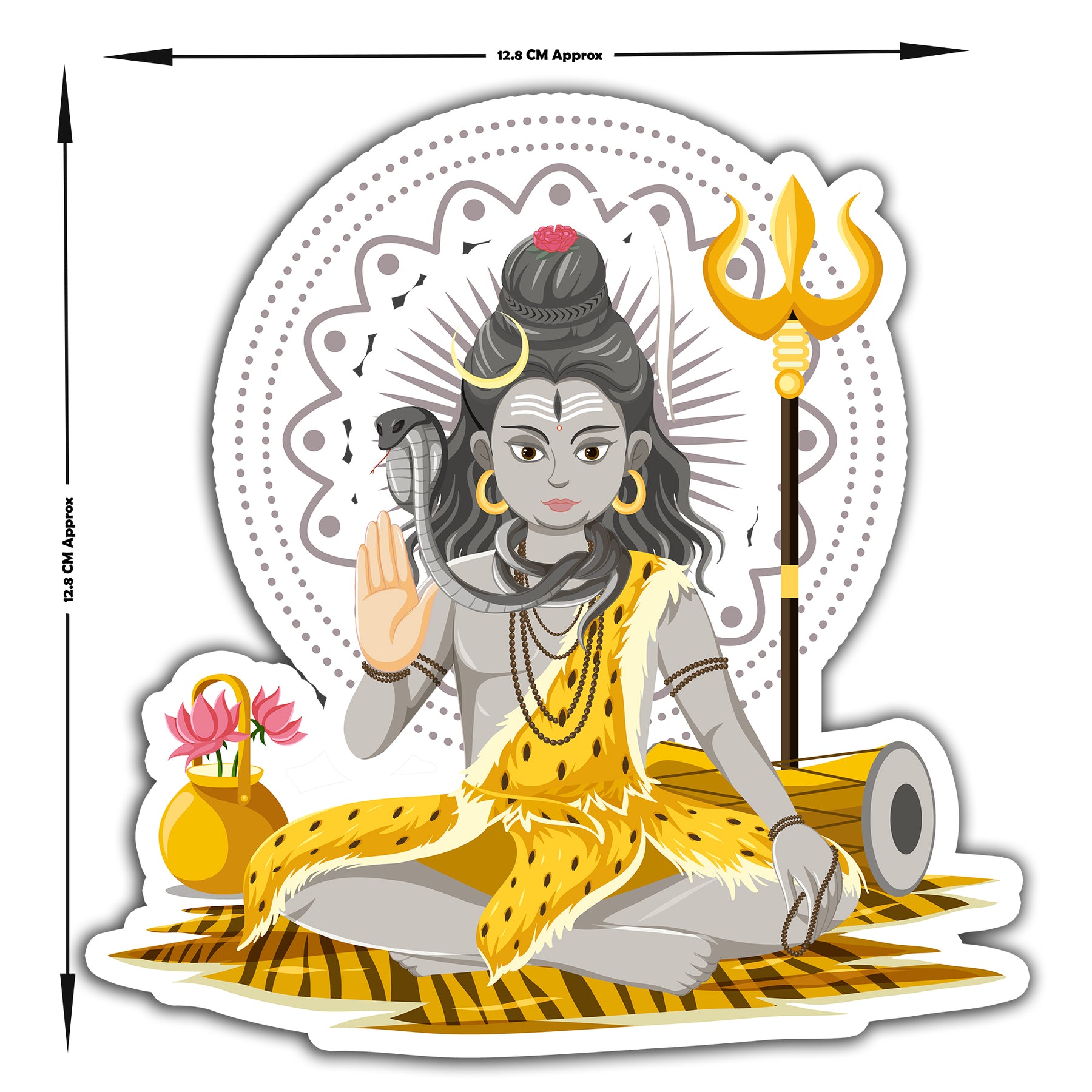 Bring peace, power, and divine blessings wherever you go with this Lord Shiva sticker, featuring a calm meditative pose, cobra, trishul, damru, and vibrant yellow attire. Ideal for pooja spaces, temple walls, vehicle dashboards, or gifting to devotees of Mahadev.