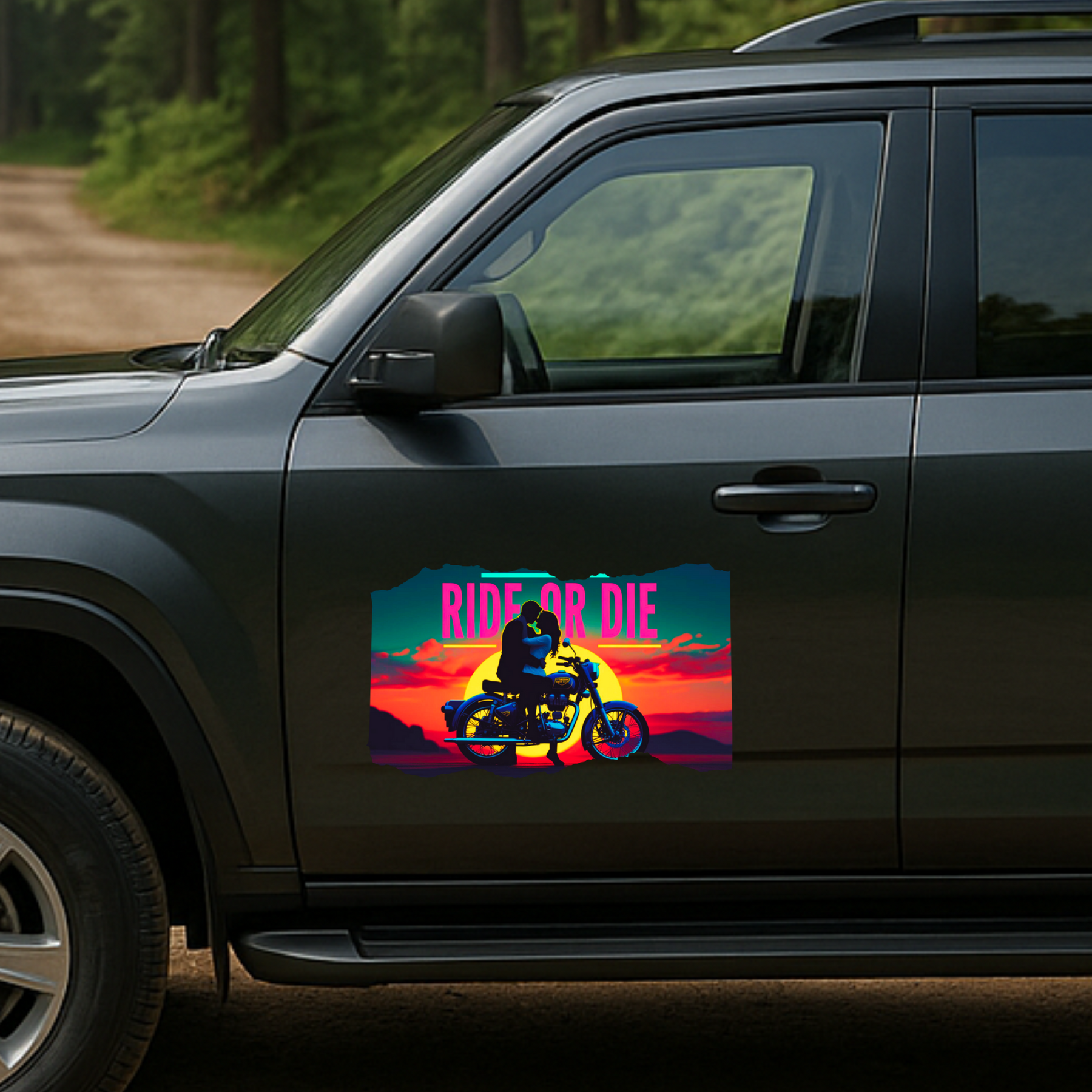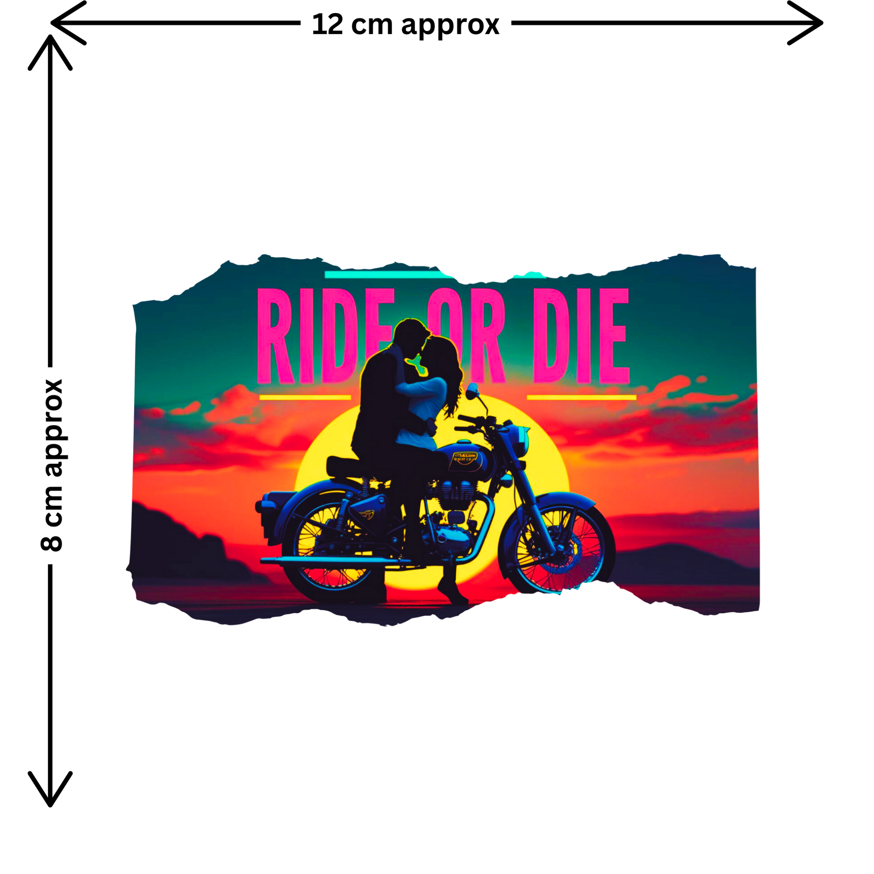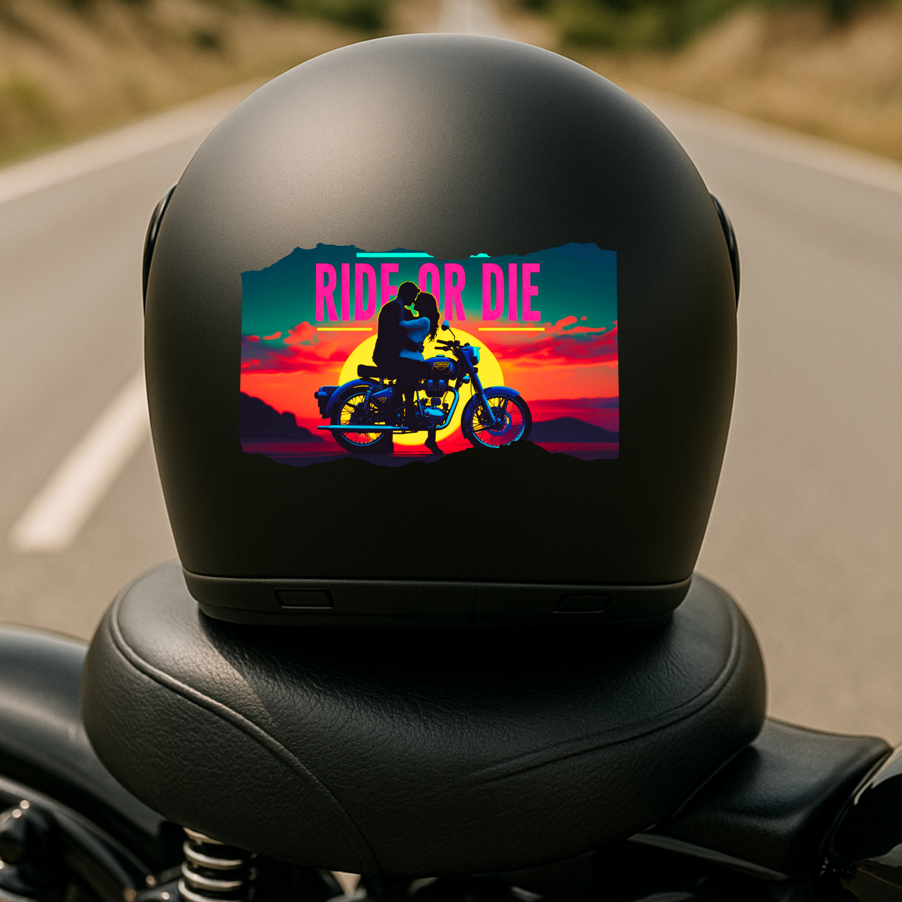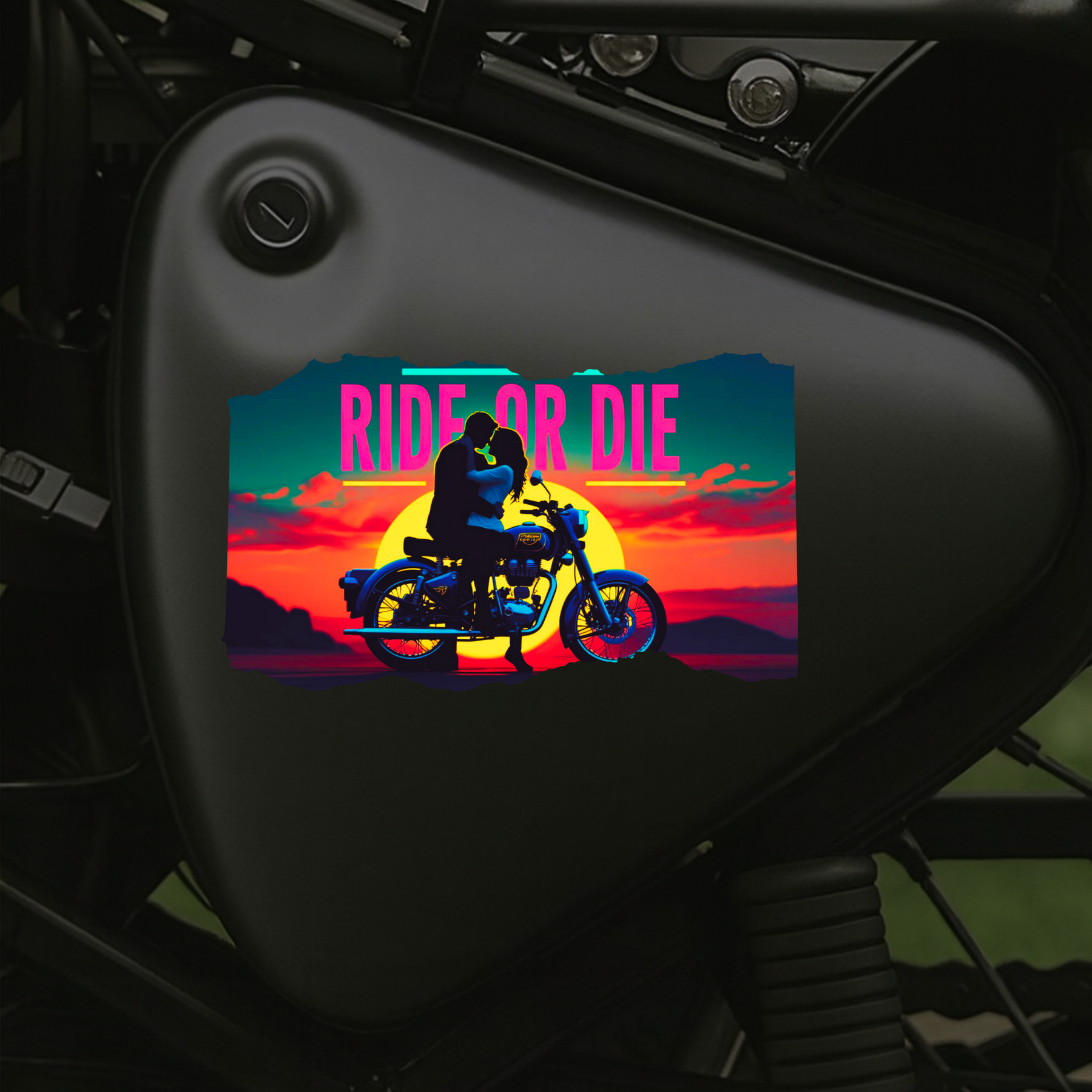 Express bold love and adventure with the STIXY Ride or Die Sticker, featuring a romantic couple on a Royal Enfield against a breathtaking sunset. Designed with vibrant neon tones and cinematic energy, it captures the ultimate bond between riders who live for the journey and each other.