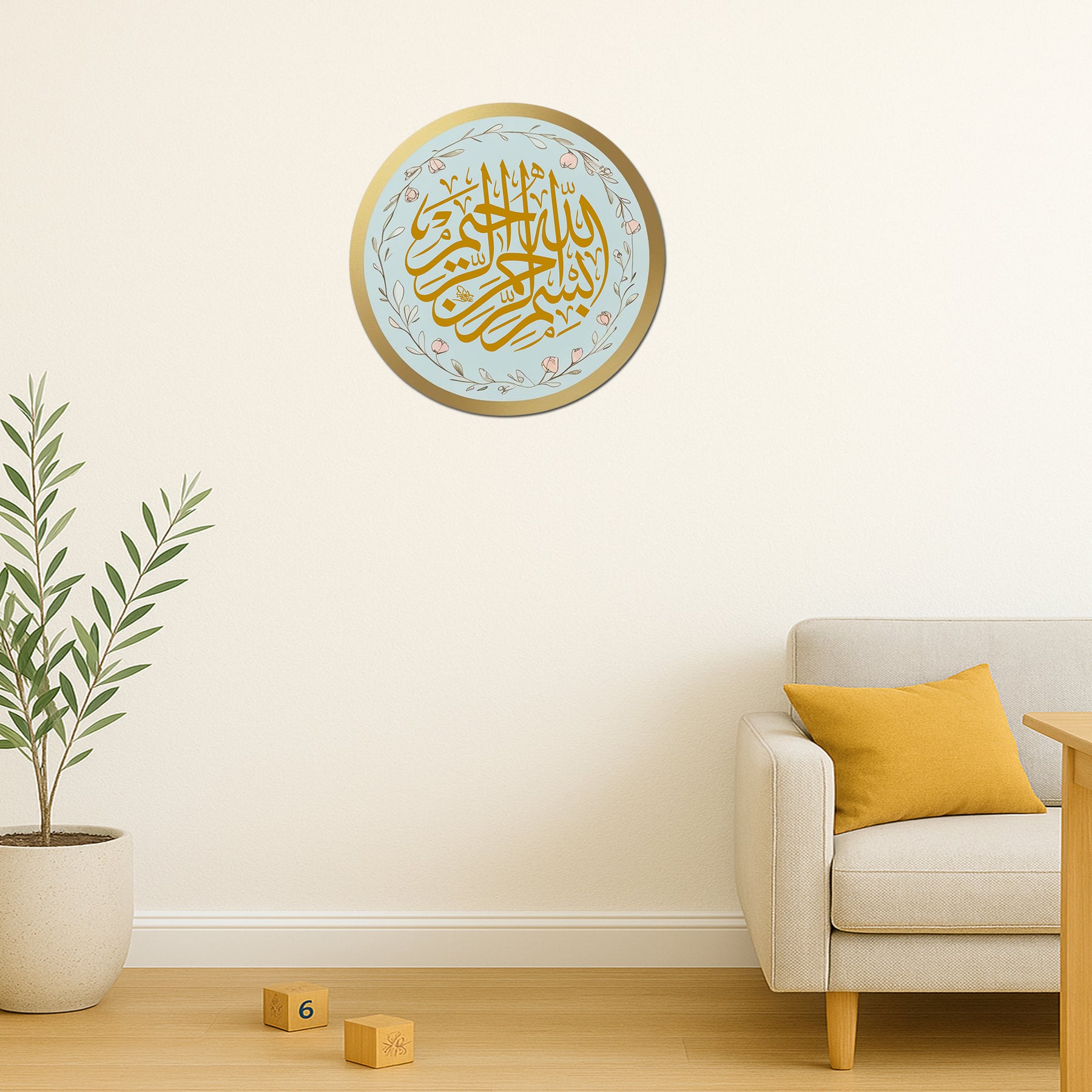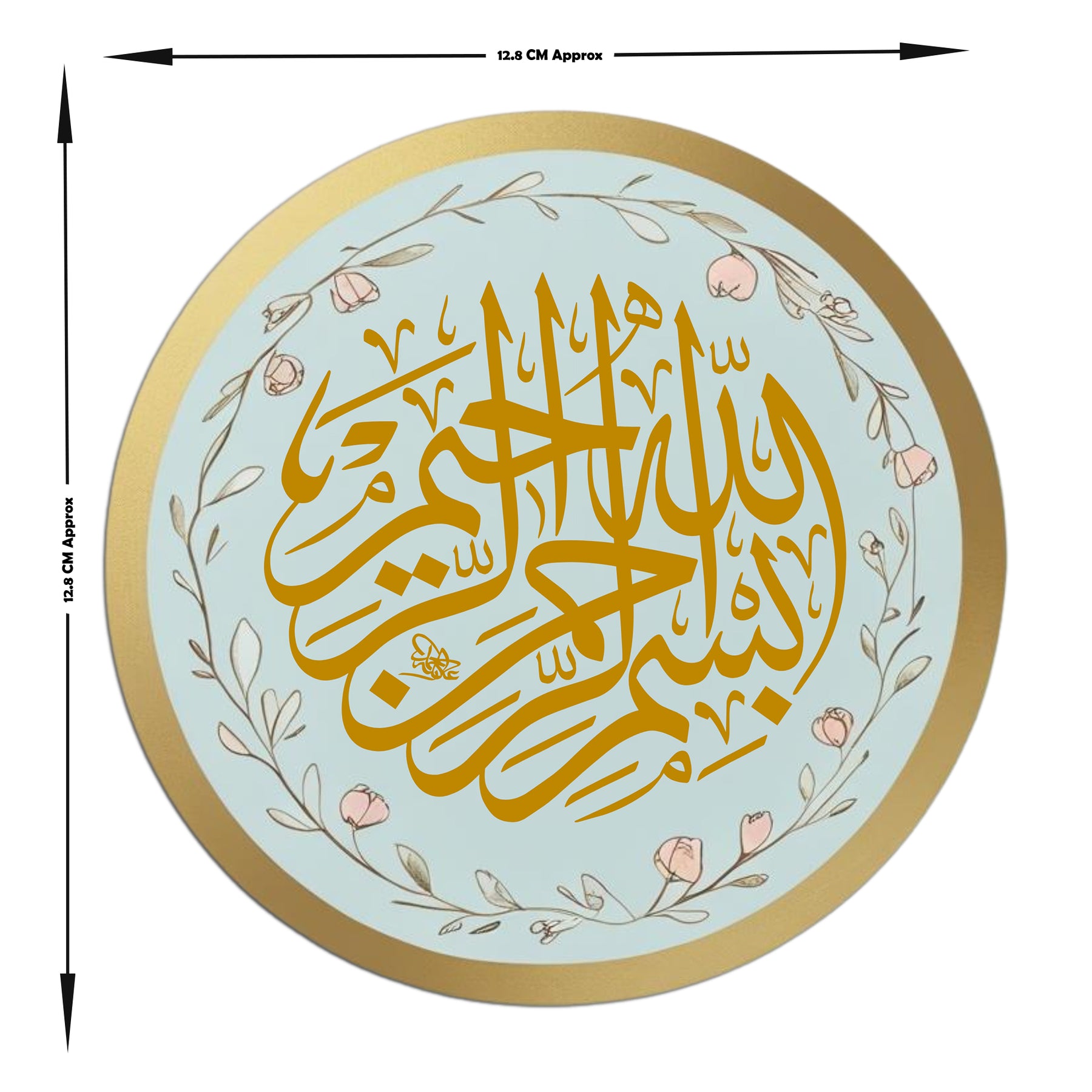 Transform any space with this premium Stixy Islamic sticker, designed with a soothing sky blue background, golden Arabic Bismillah calligraphy, and delicate floral border. The gold rim adds a luxurious finish, making it ideal for prayer corners, Islamic room decor, Eid gifting, or even elegant car and laptop decoration. Crafted with water-resistant, durable vinyl, this round sticker carries spiritual grace in a minimal yet classy style perfect for modern homes.