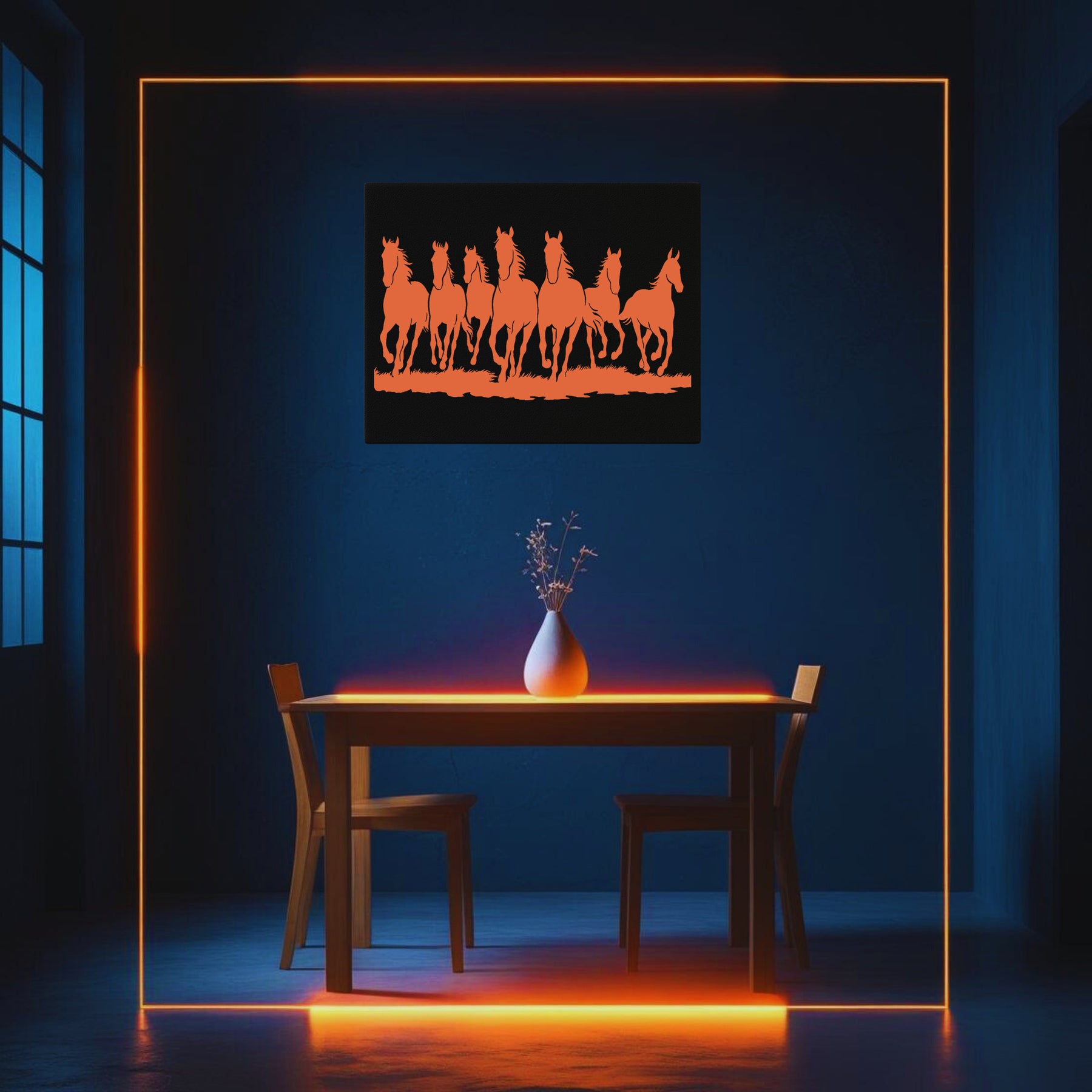 Bring home unstoppable energy and grace with this premium 7 Horses Wall Frame. Crafted on high-quality cotton canvas with rich orange vinyl, this design is more than décor — it’s a spiritual symbol of power, success, and Vastu positivity. Ideal for living rooms, offices, or meditation corners, this frame charges under light and glows in the dark, adding a divine presence to your space.