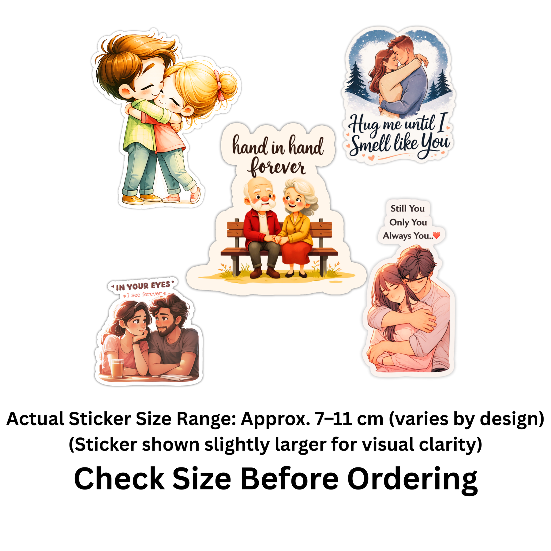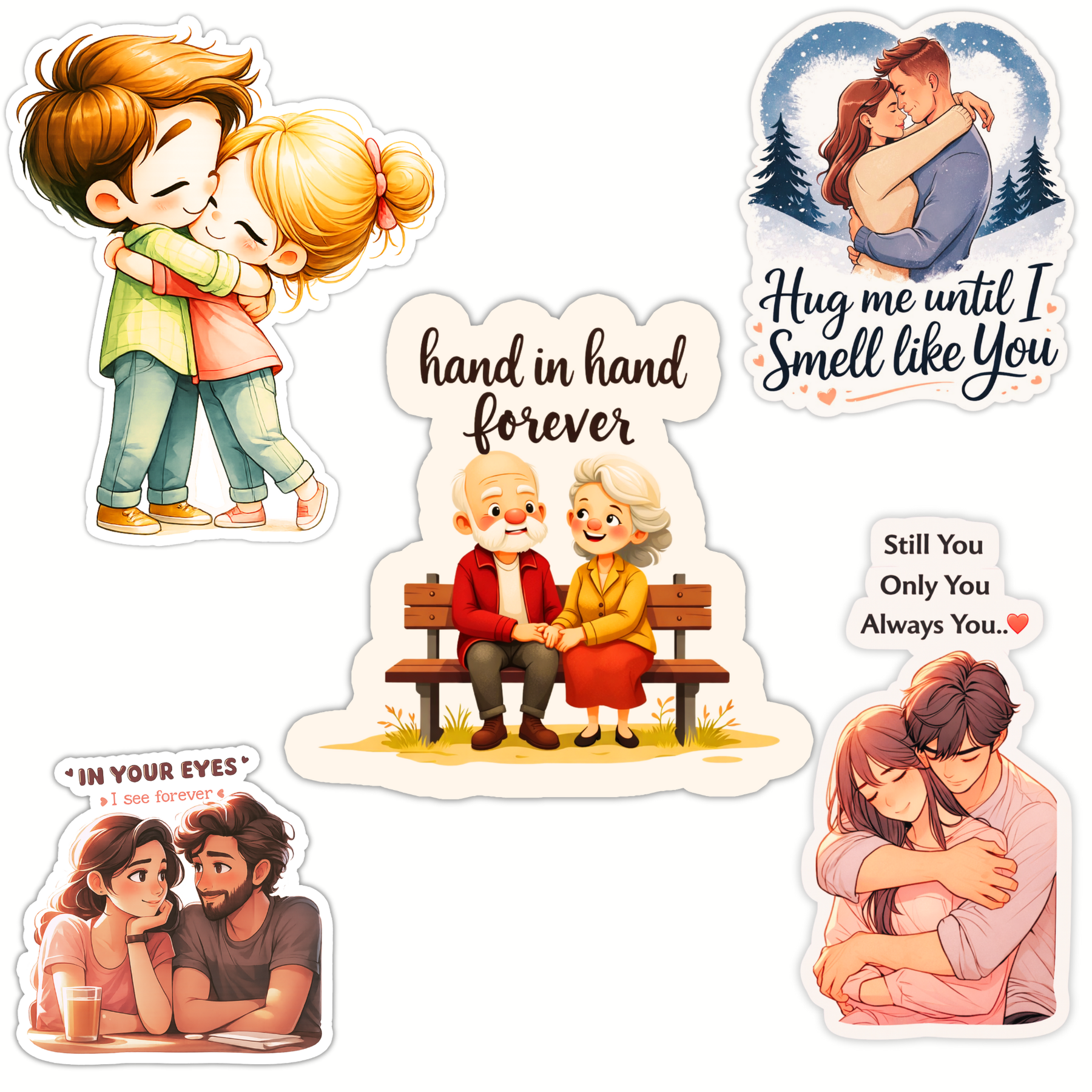 Celebrate love in its most pure and emotional form with this STIXY Romantic Couple Love Sticker Set of 5. This set features beautifully illustrated couples expressing hugs, togetherness, and lifelong bonding, paired with heartfelt quotes that capture real relationship emotions. From young love to forever companionship, each design tells a warm story, making this set perfect for couples, gifting, or personal expression.