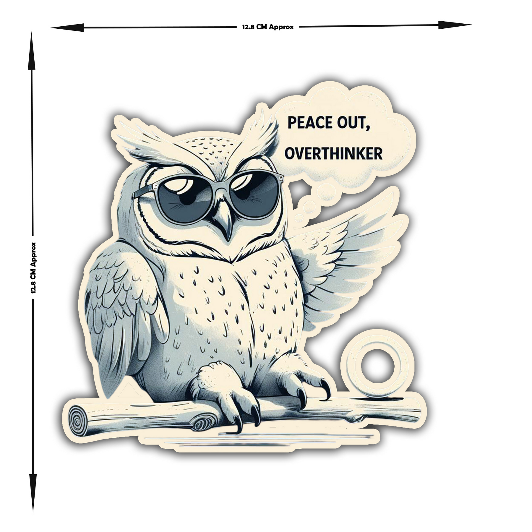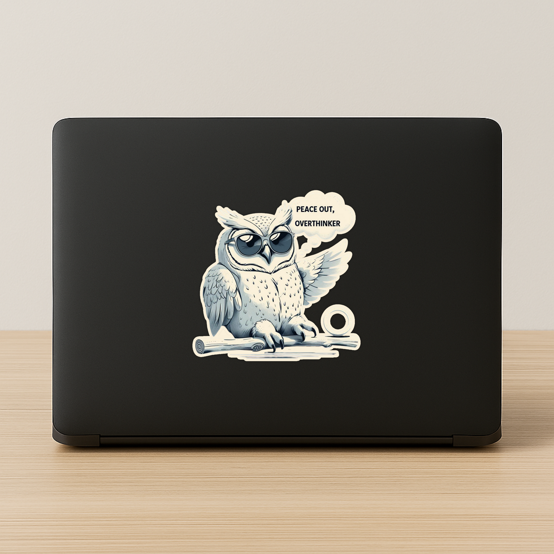 Add a splash of wisdom and attitude with this funky owl sticker featuring the quote "Peace Out, Overthinker." With a sketched vintage style and stylish shades, this water-resistant vinyl sticker is perfect for laptops, planners, journals, or mirrors — wherever your brain needs a break.