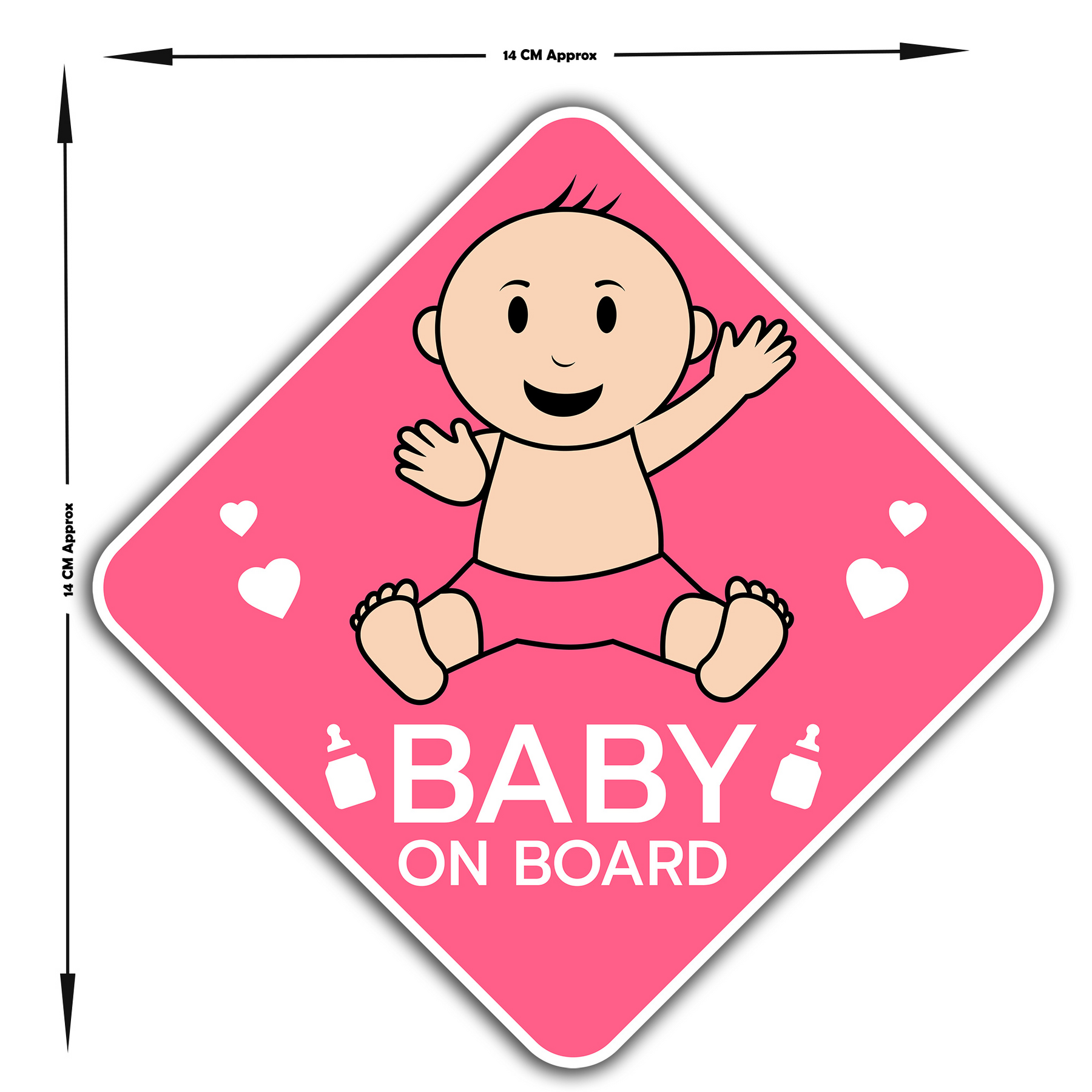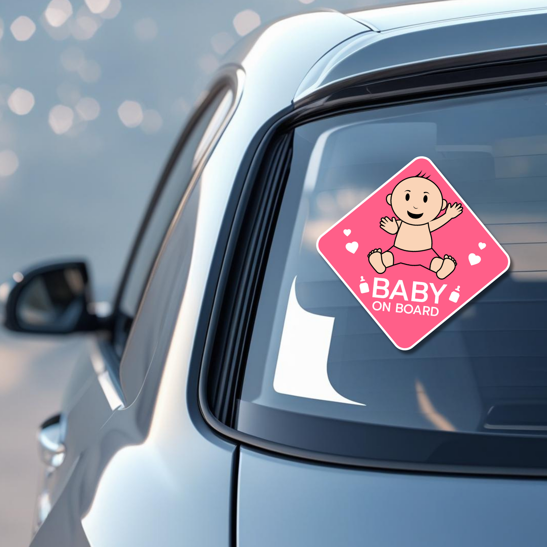 Ensure your little one’s safety on the road with this adorable Baby On Board waterproof sticker in a bright pink theme. Featuring a happy cartoon baby and heart icons, this design grabs attention while keeping the ride cute and protected.